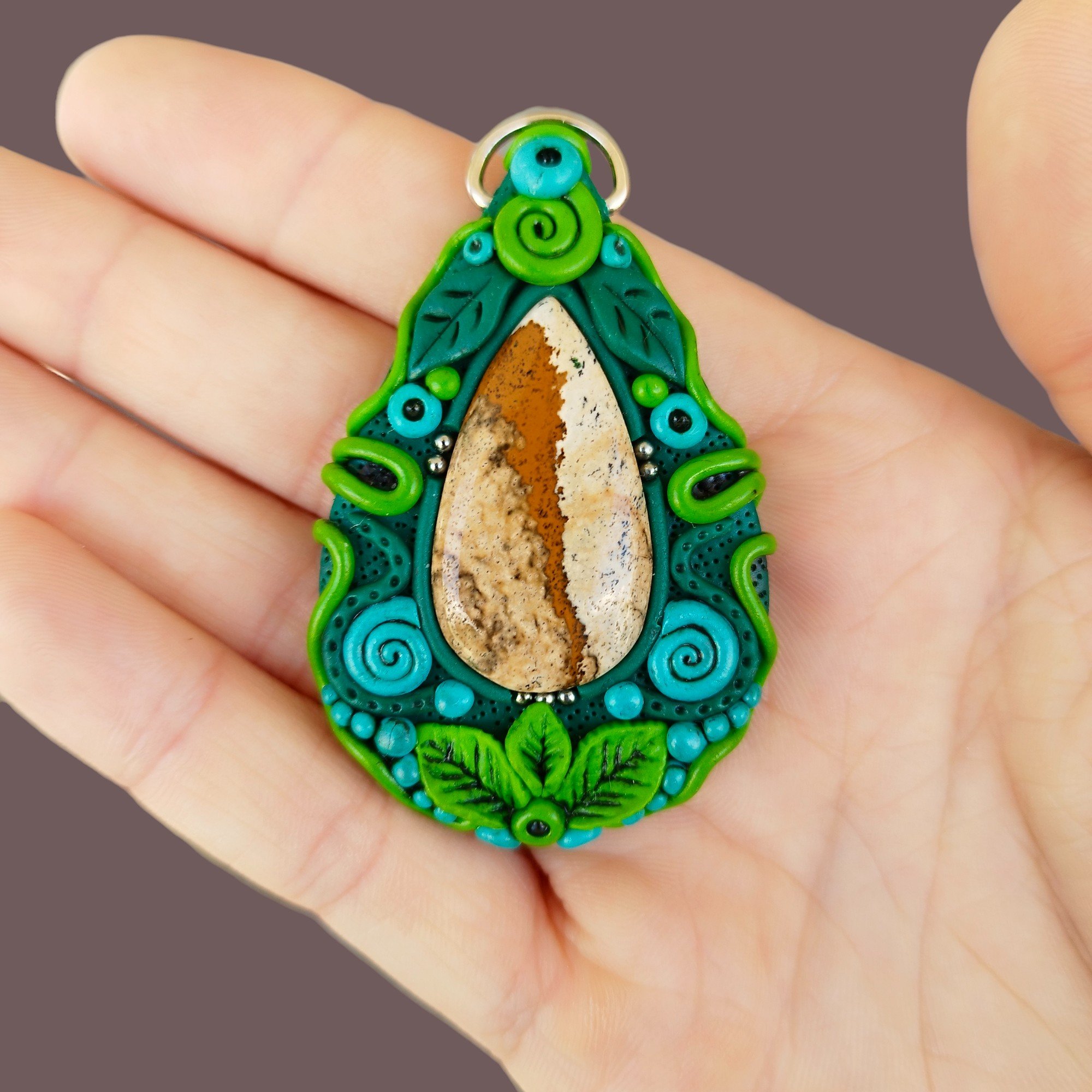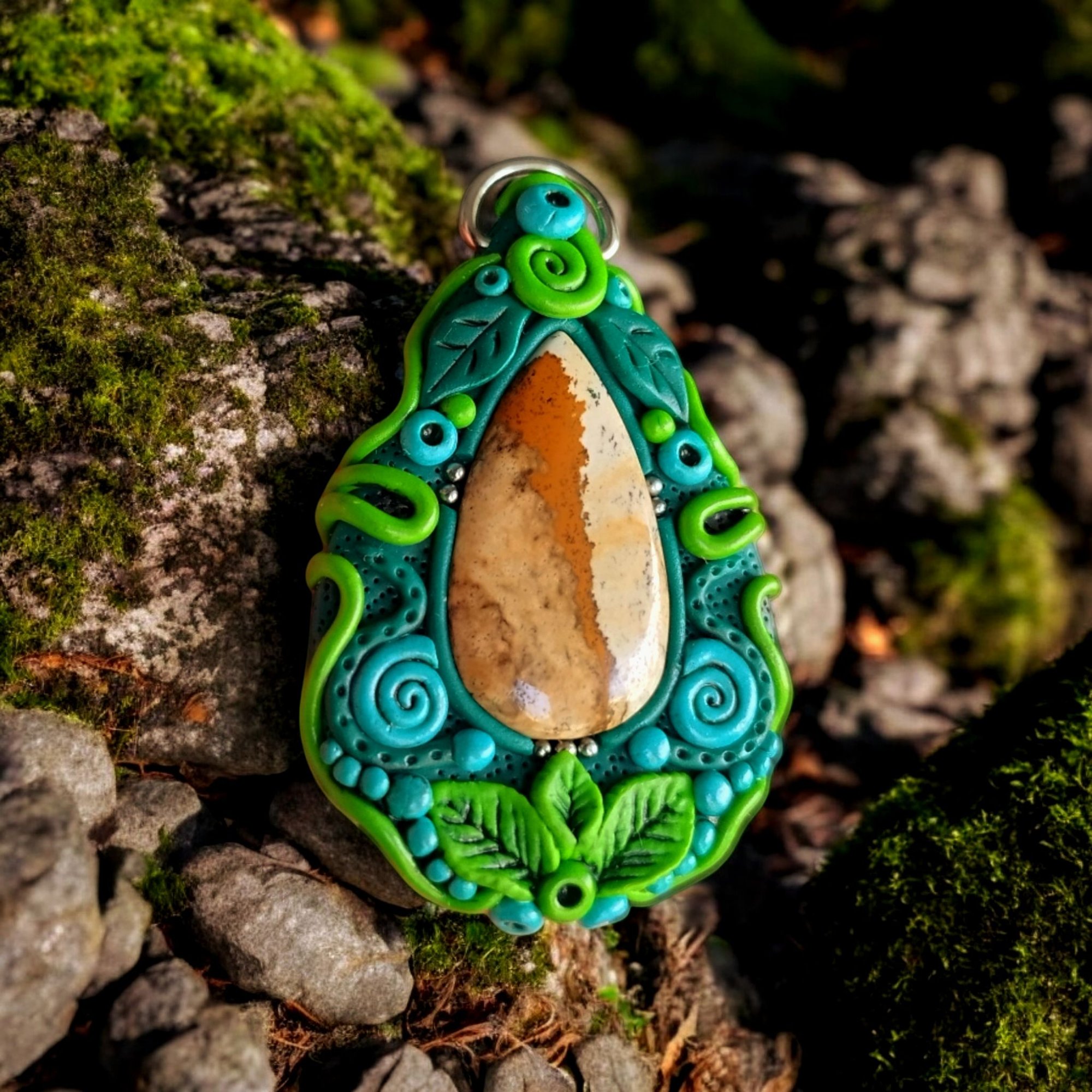 Green and blue leafy spiral pendant featuring picture jasper, handcrafted with vibrant tones and forest-inspired design. A grounded, nature-loving statement piece.