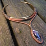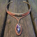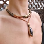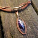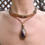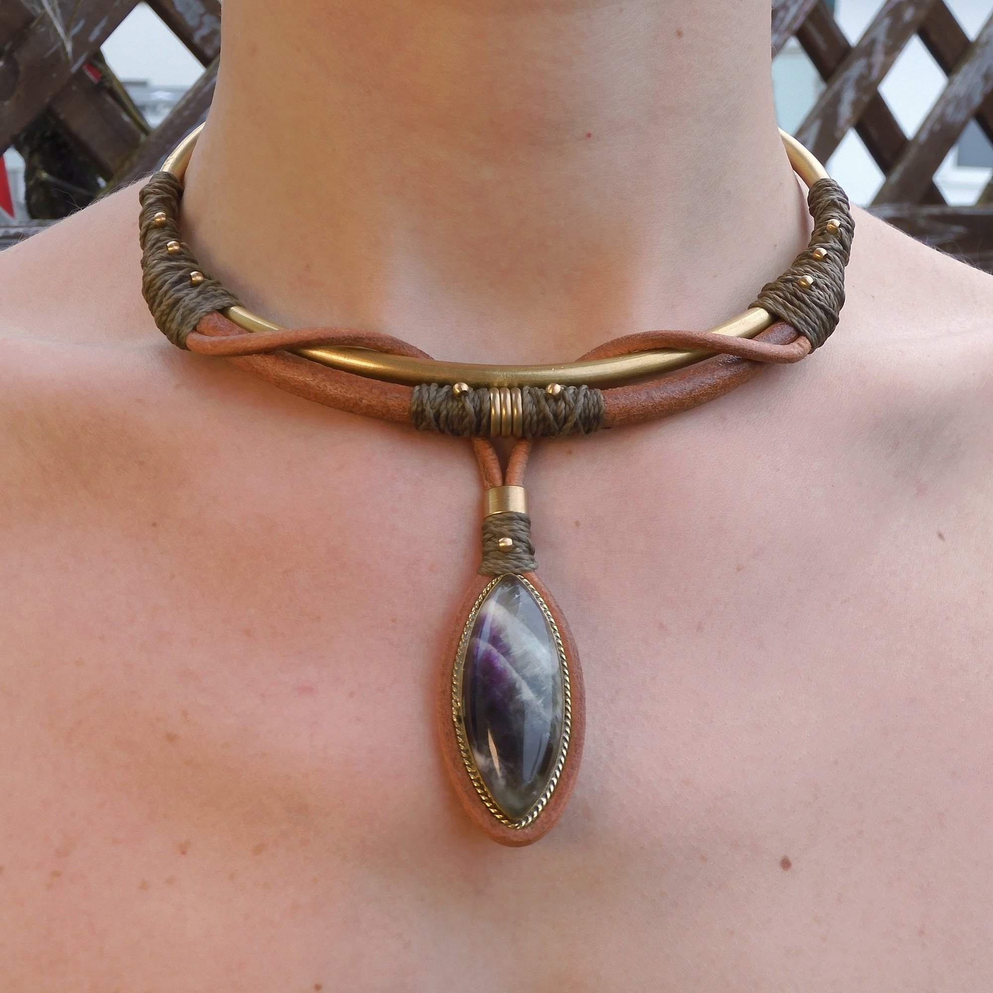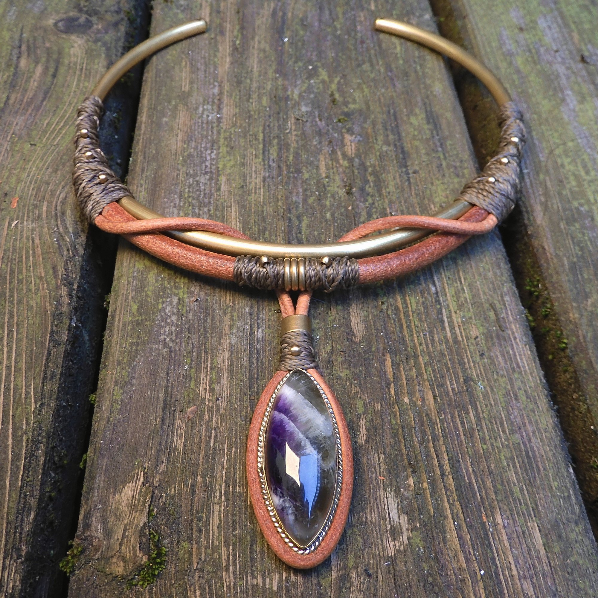 -> High quality amethyst cabochon choker necklace with raw brass, leather, and macrame string.
