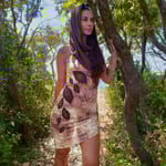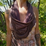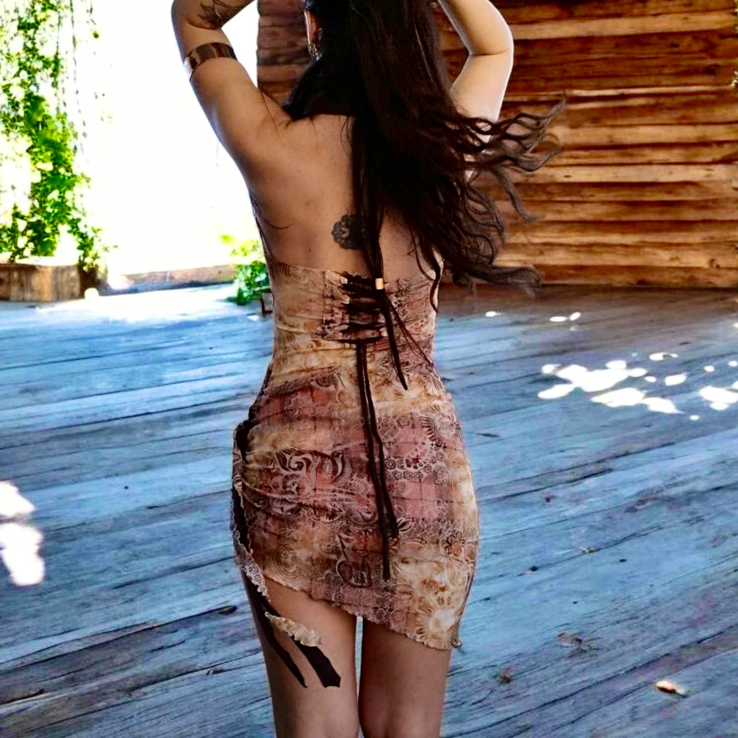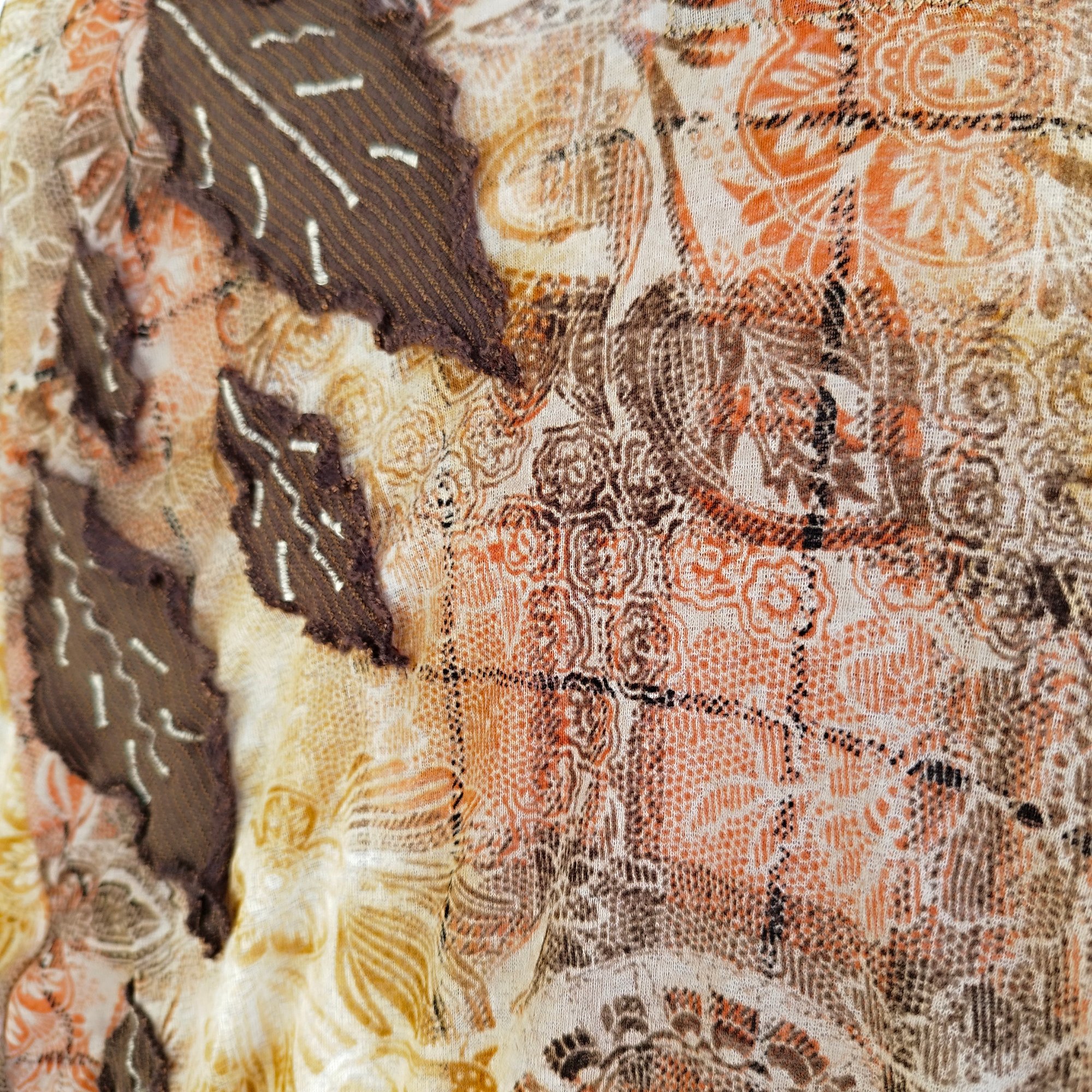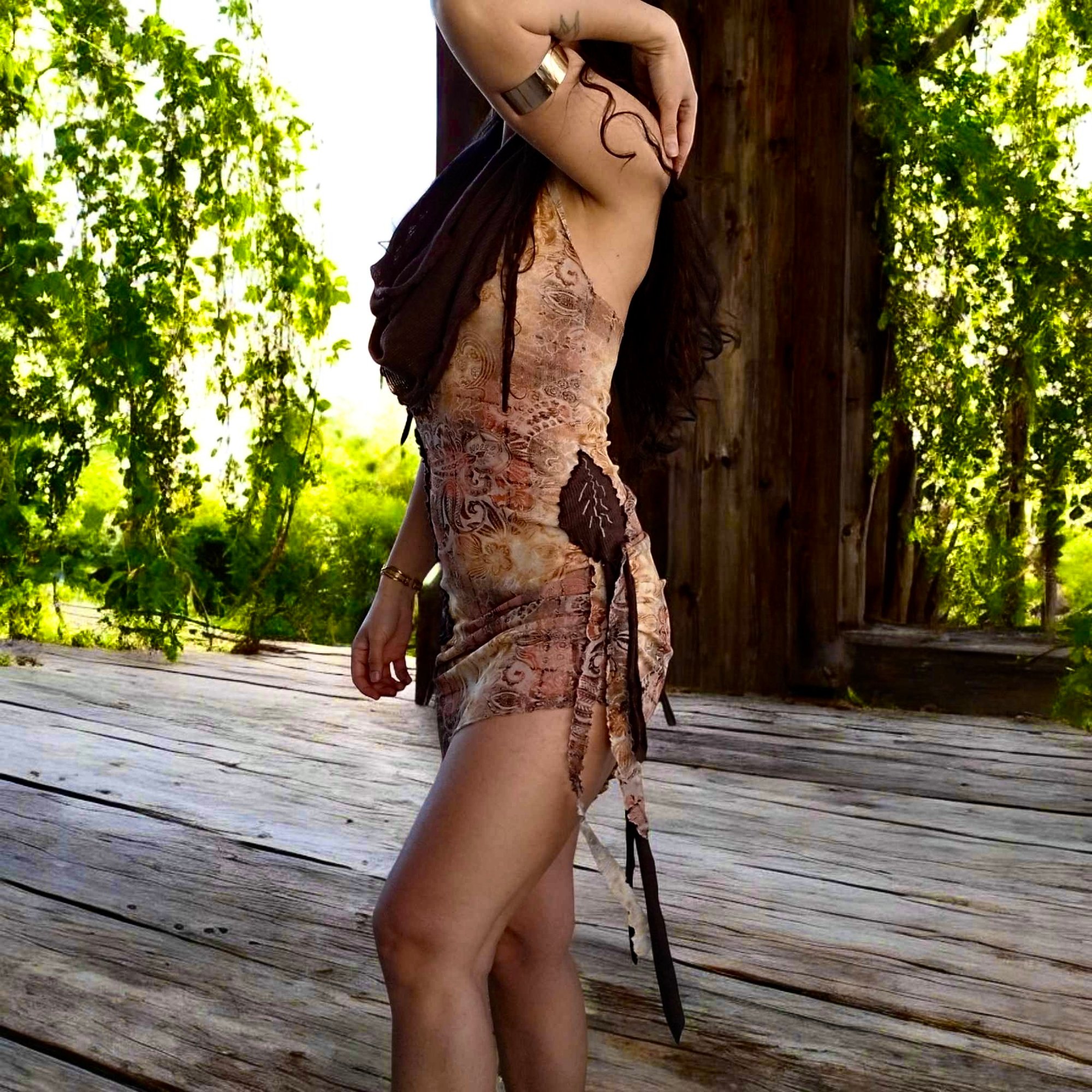 Made from soft, ultra light, stretchy paisley pattern material with handmade leaves and details. Attached scarf which can double as a hood. Tie up in the back and falling details on the side. Lots of textures and warm shades. Earthy, forest themed dress for festivals and nature inspired individuals.