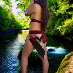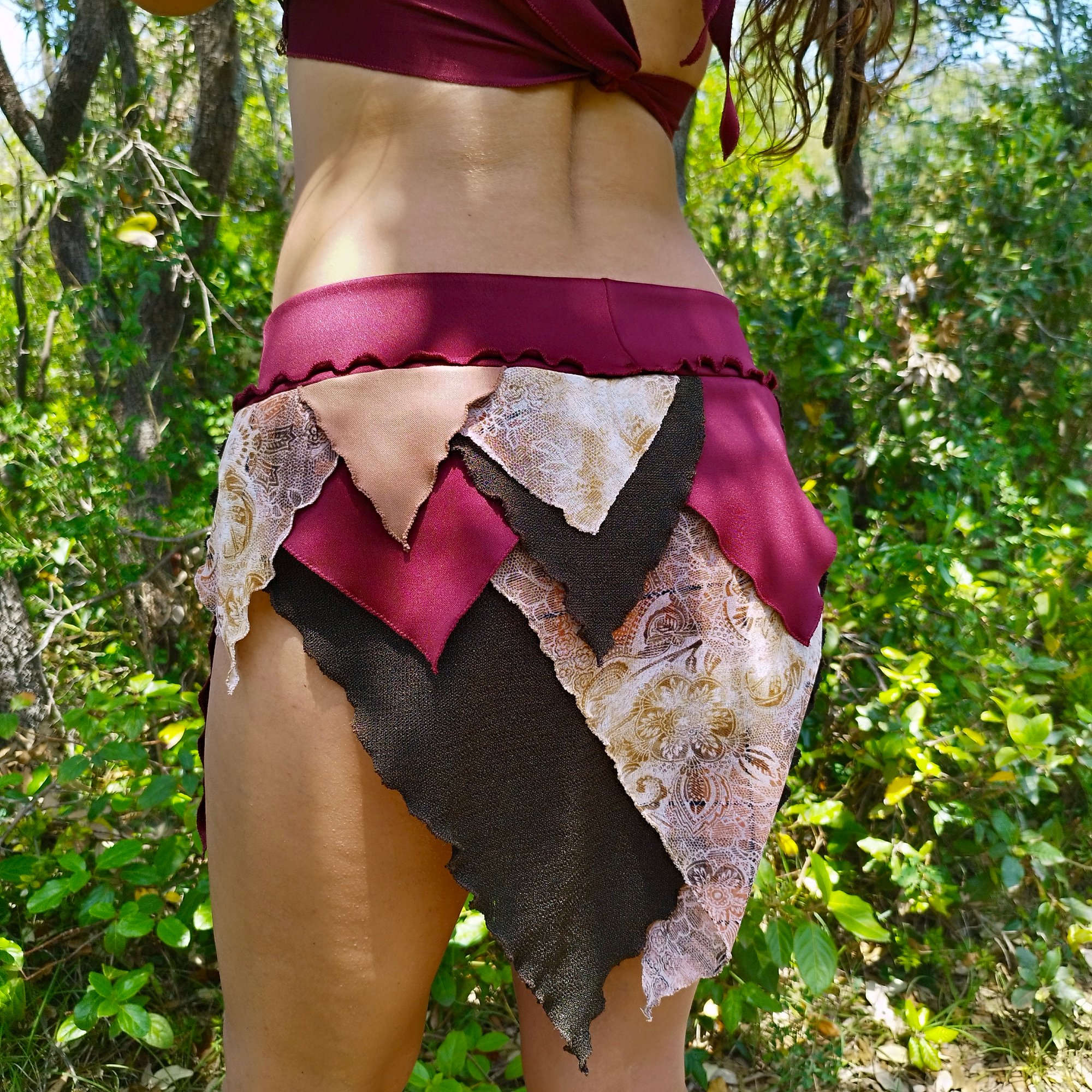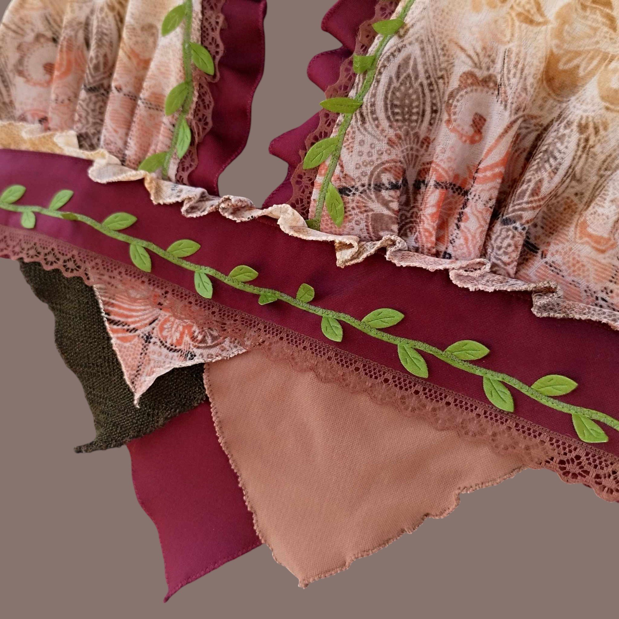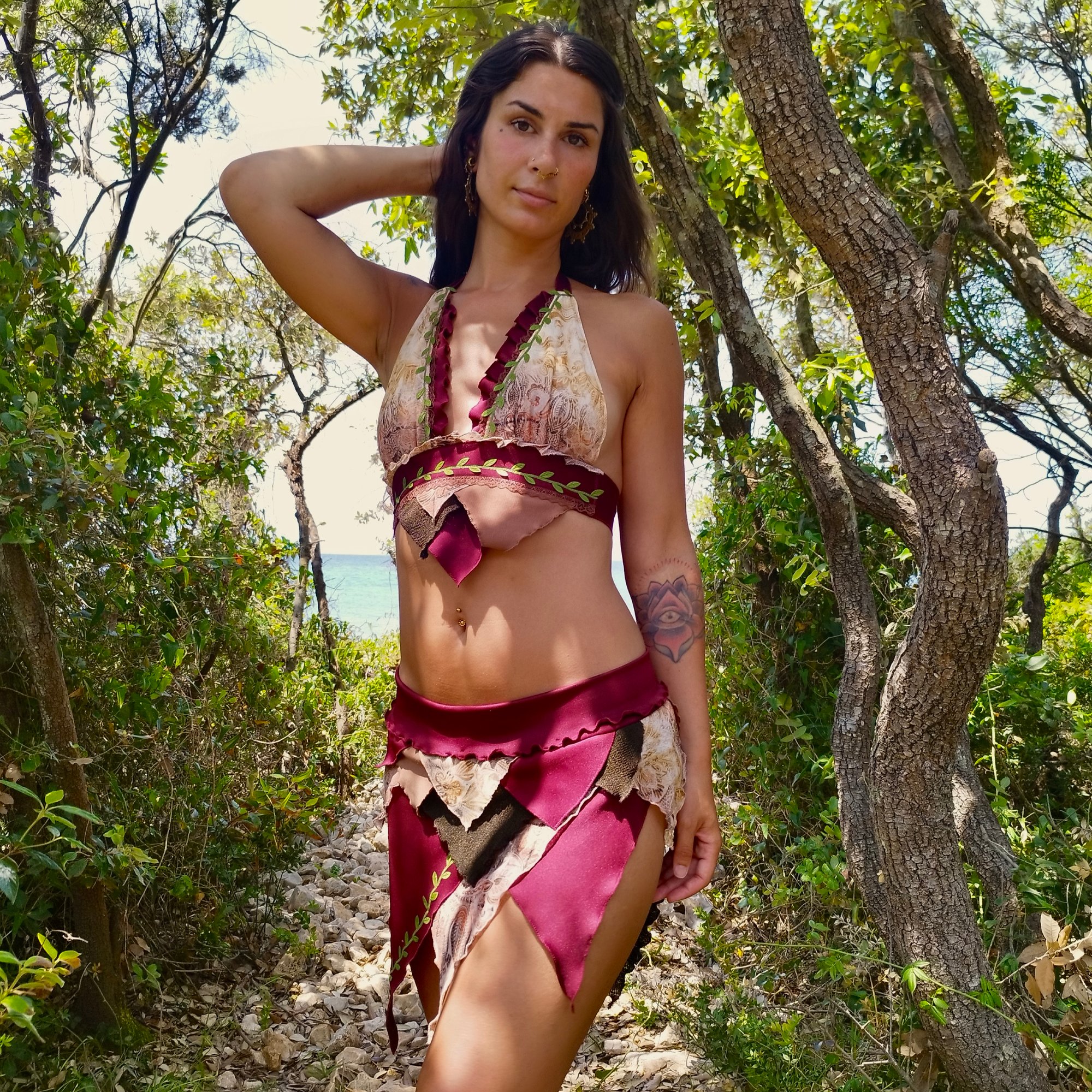 Earthy burgundy and paisley leaf set with layered textures and colours, soft stretchy belt, and light fabric that feels weightless. Enchanting, ethereal design perfect for fairy and festival fashion.