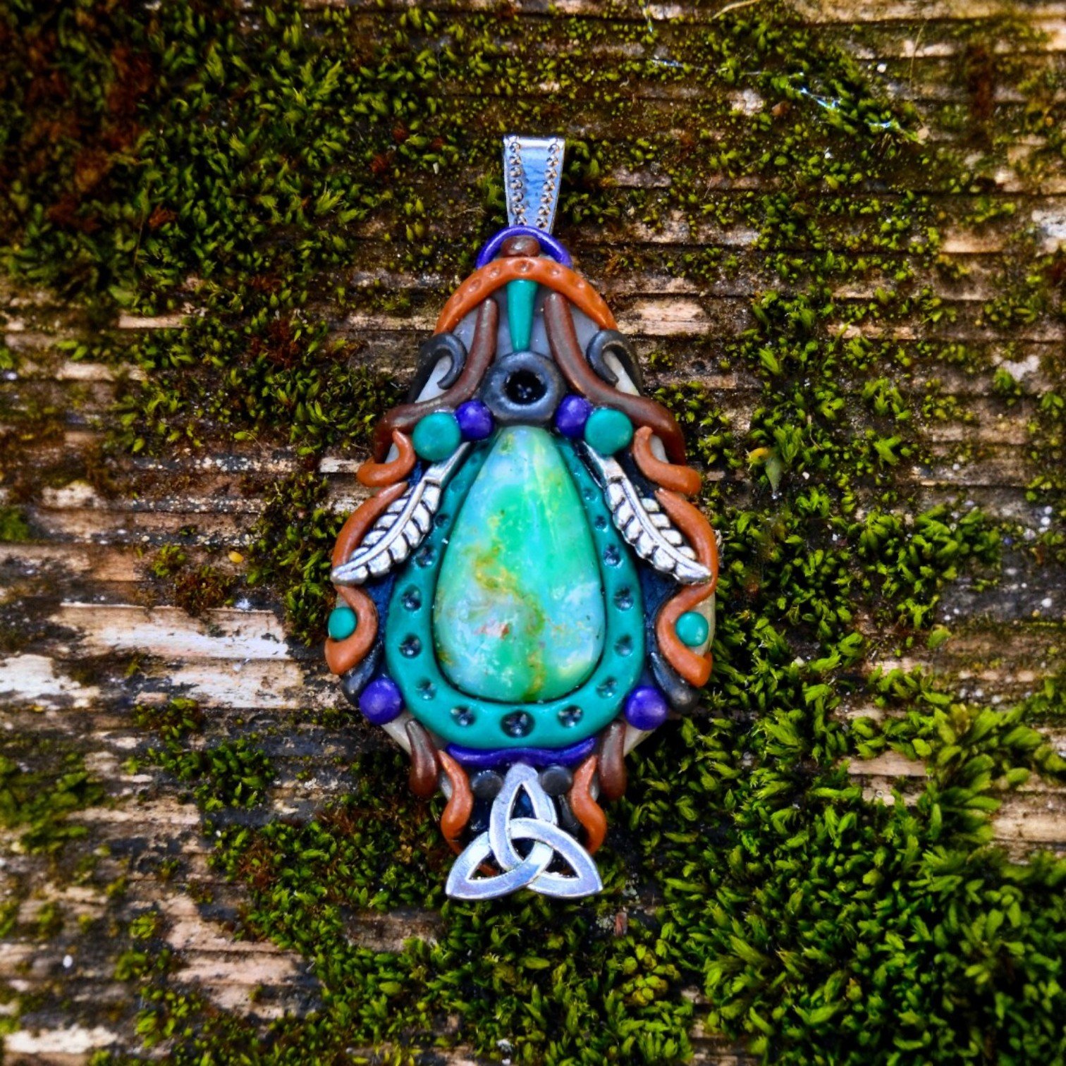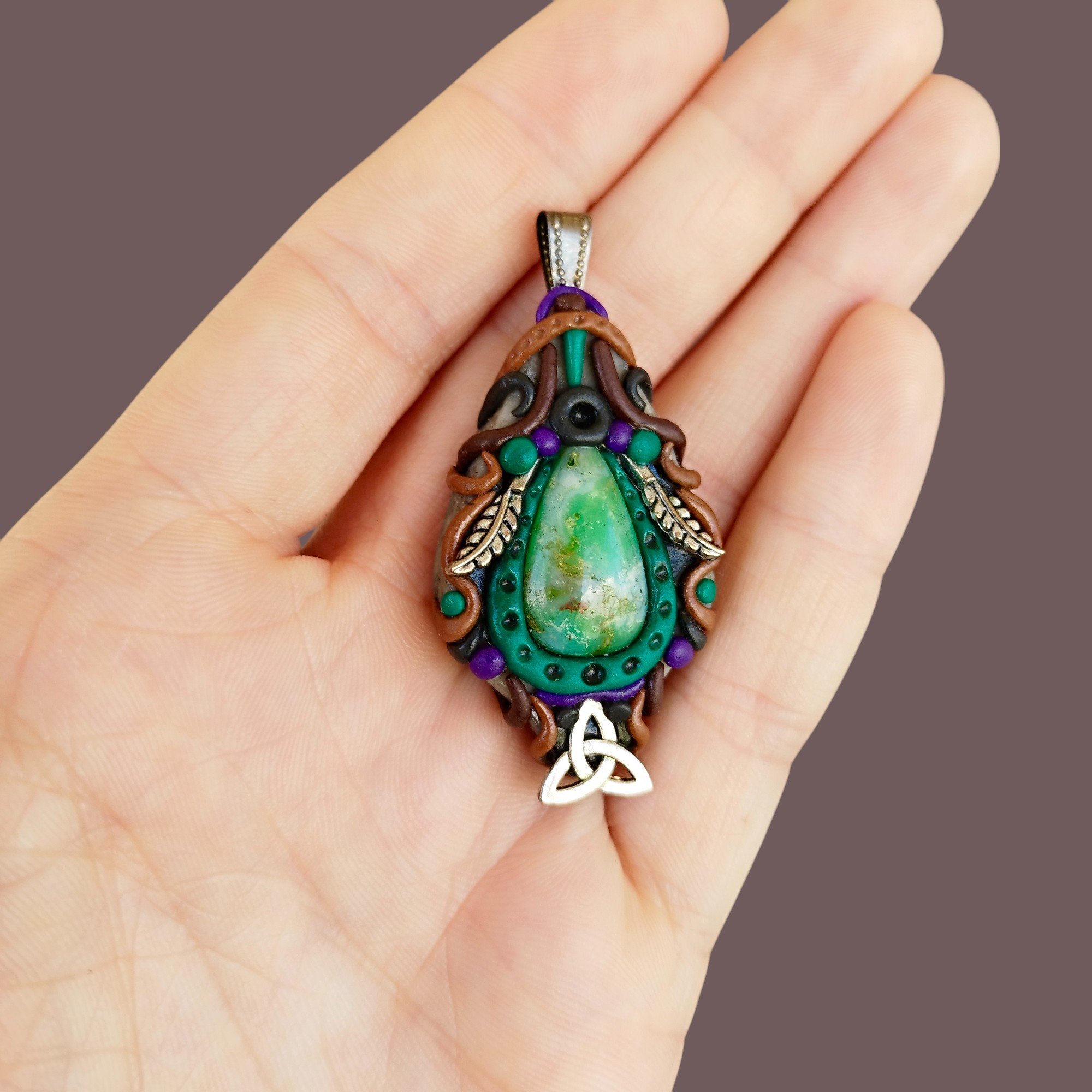 Silver Triquetra pendant with chrysoprase, handcrafted from polymer clay. A Celtic-inspired design blending nature and symbolism.