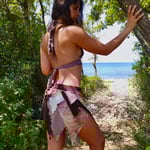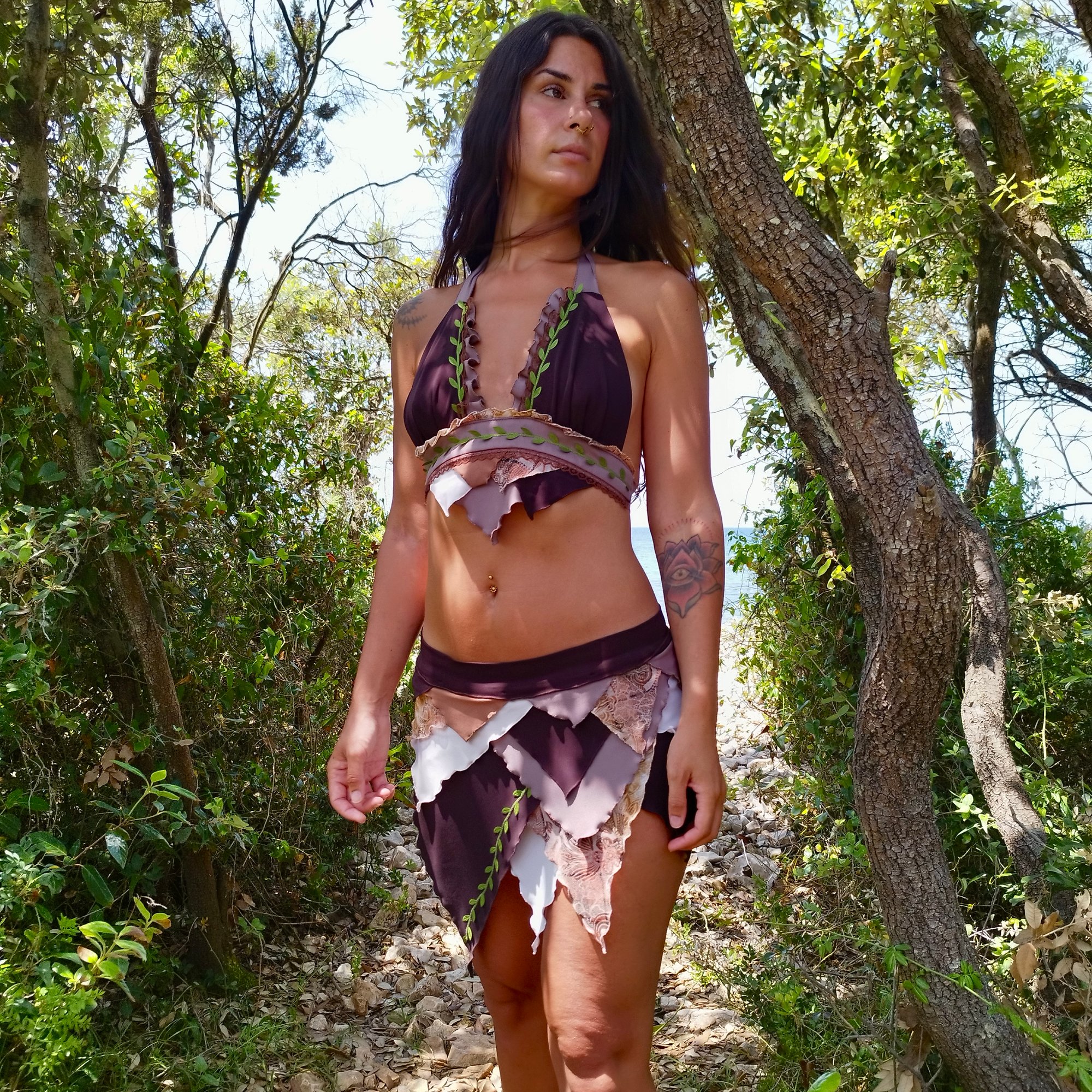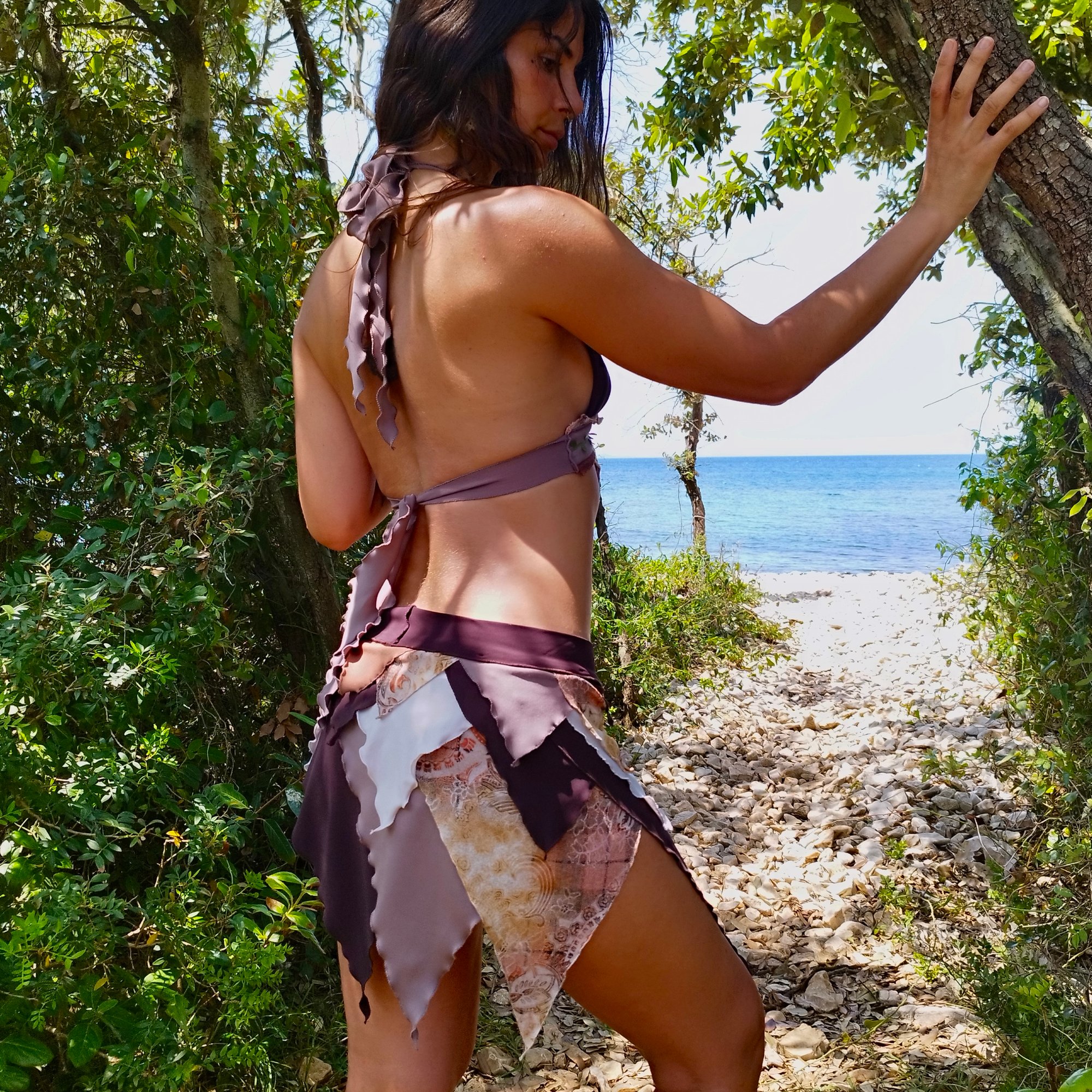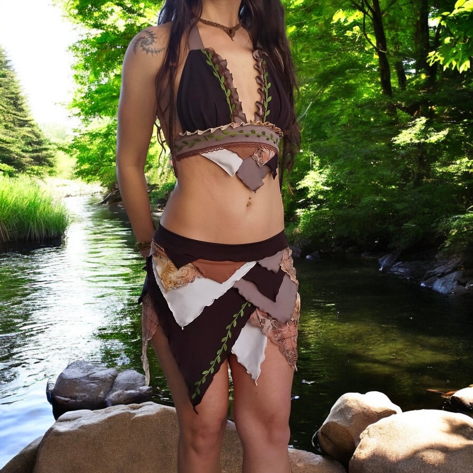 Dark brown, dark beige, earthy warm paisley leaf set with layered textures and colours, a soft stretchy belt, and light fabric that feels weightless. Enchanting, ethereal design perfect for fairy, festival, and earthy fashion.