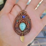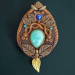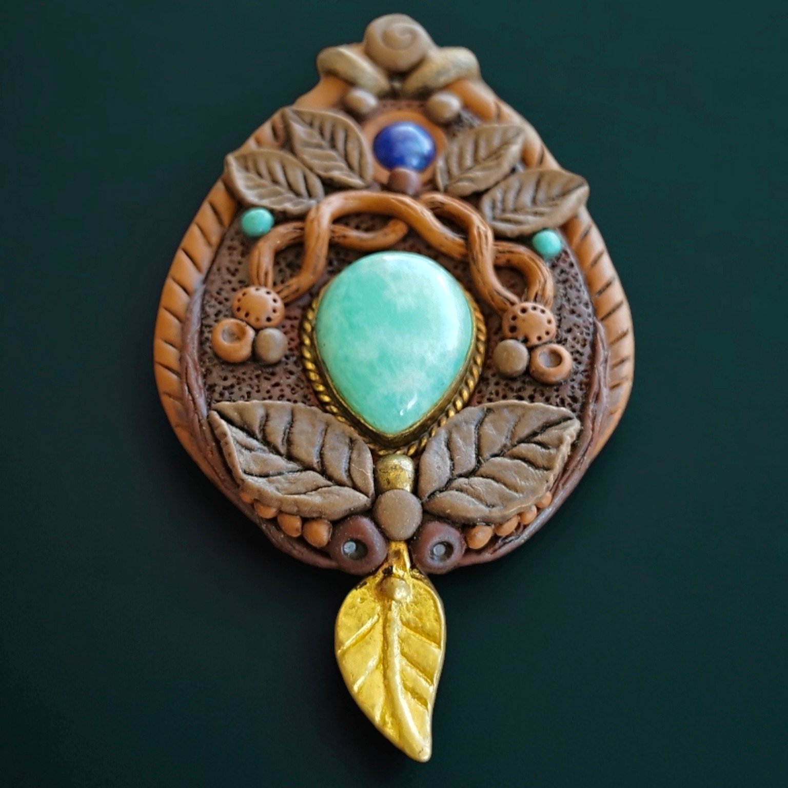 Handcrafted earthy brass Leaf polymer clay pendant, featuring a beautiful combination of Amazonite and Sapphire gemstones. Designed with organic, nature-inspired patterns, the etched brass leaf adds a rustic, earthy charm. Perfect for nature types and for festivals.
