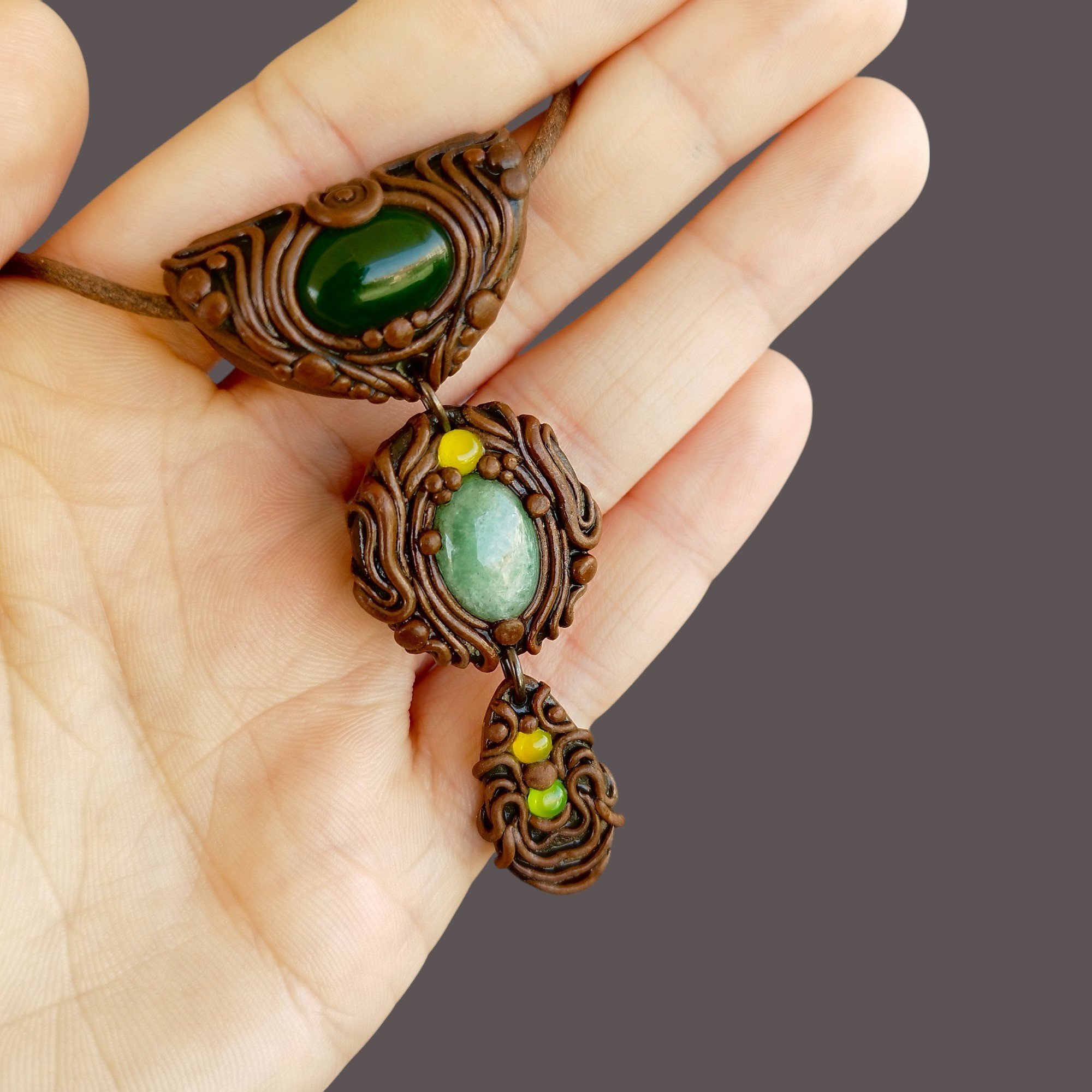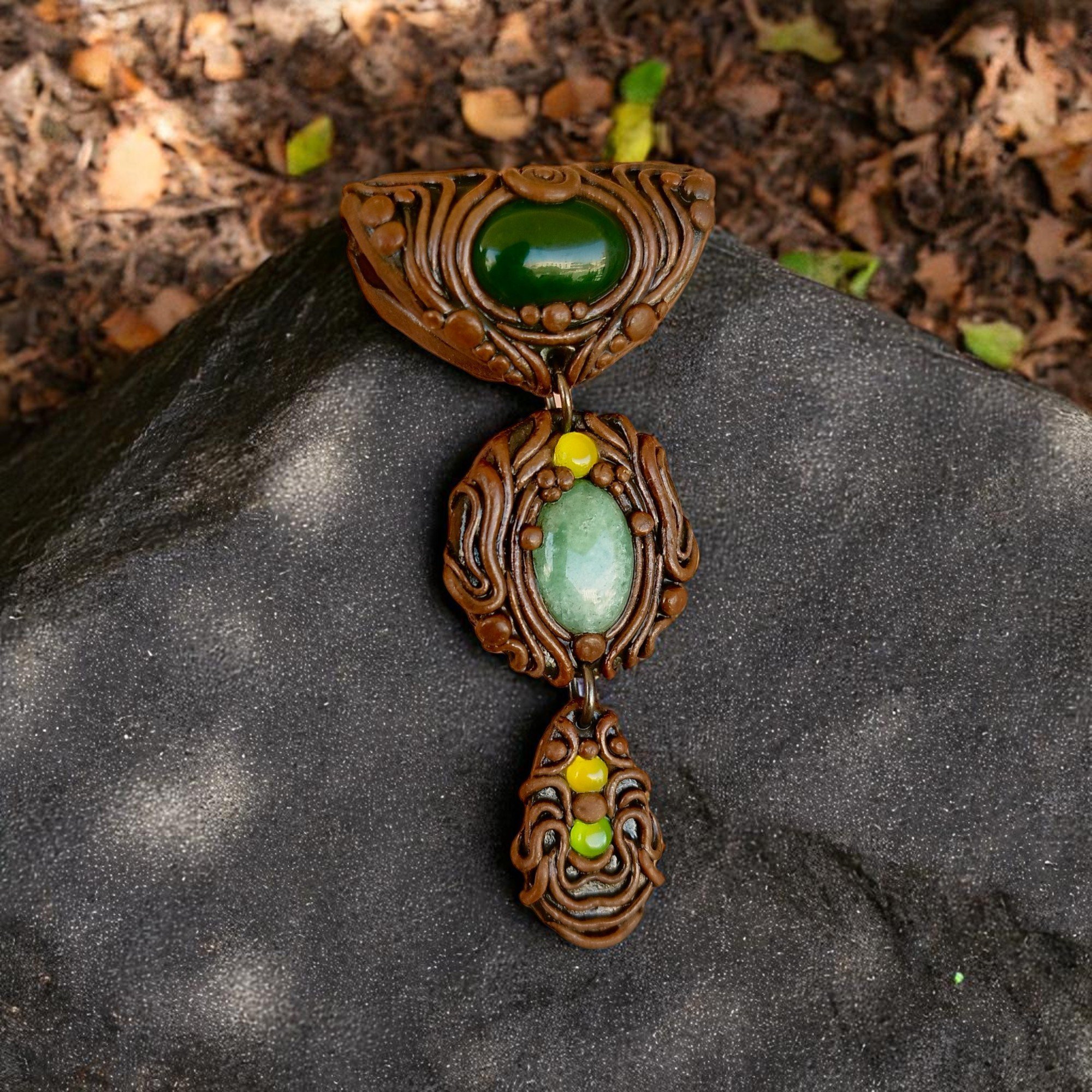 Layered green onyx and amazonite pendant in earthy browns, handcrafted from polymer clay with a tribal-inspired design.