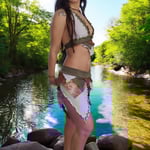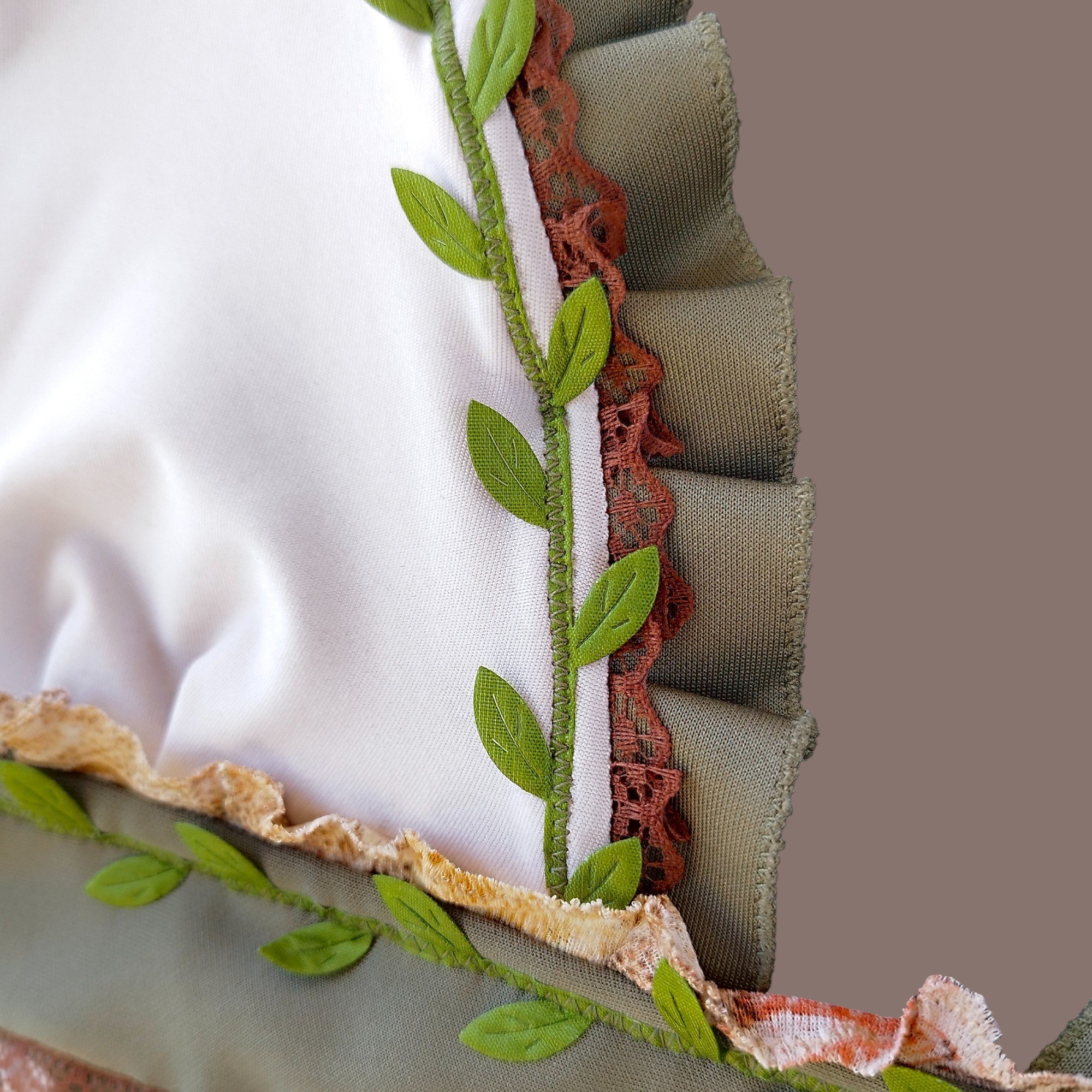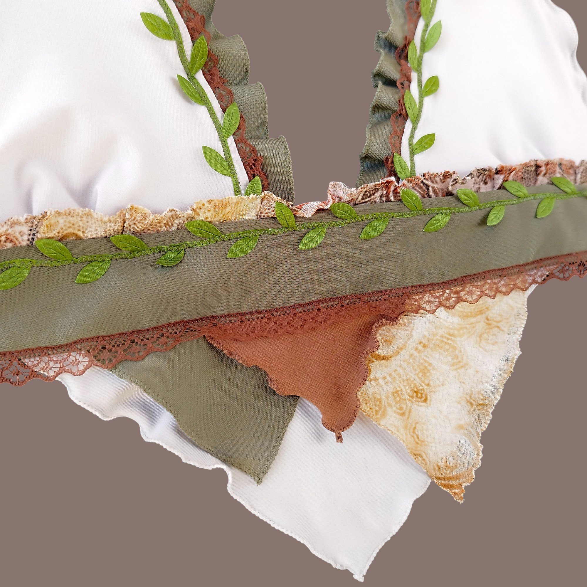 Earthy green, light beige, warm paisley leaf set with layered textures and colours, a soft stretchy belt, and light fabric that feels weightless. Enchanting, ethereal design perfect for fairy, festival, and earthy fashion.