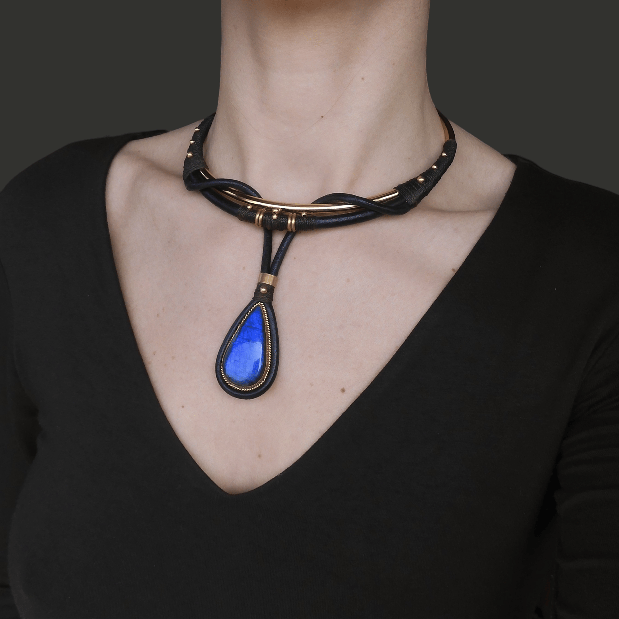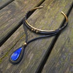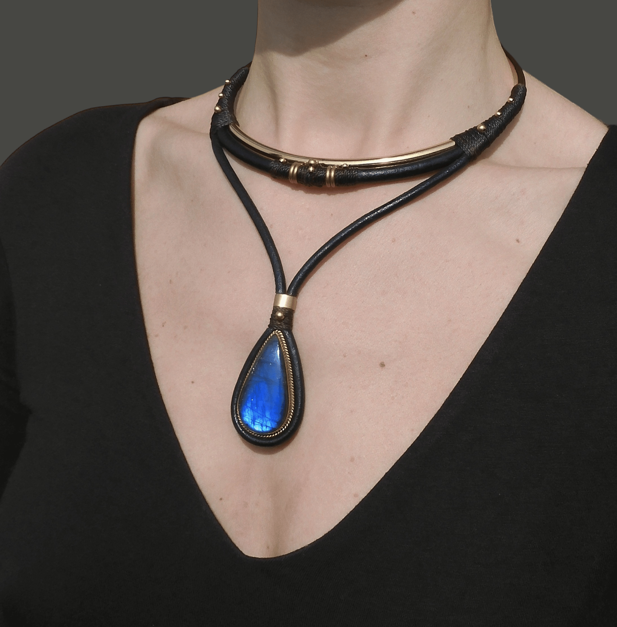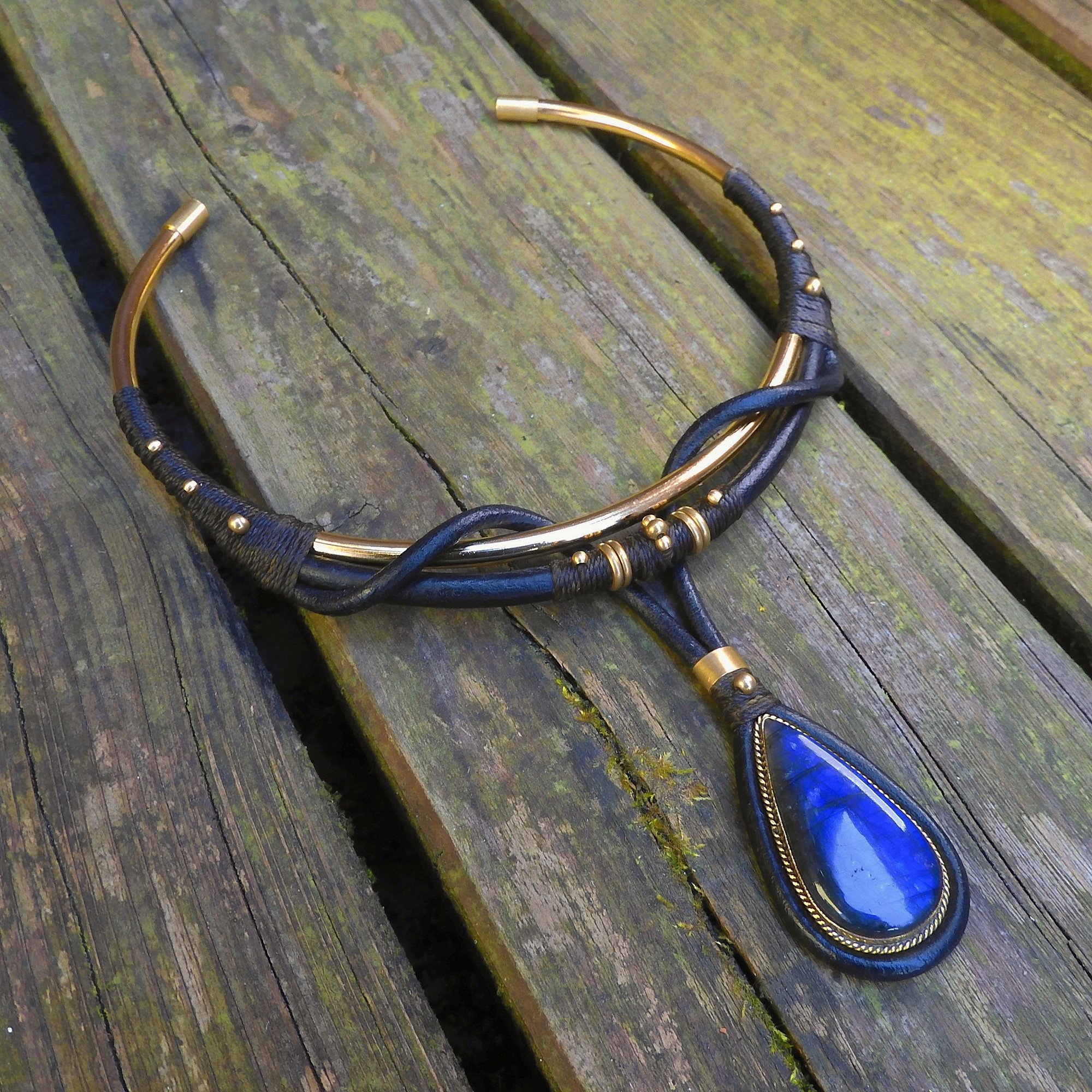 -> Featuring a vibrant deep blue labradorite pendant using leather, all raw brass, and waxed cord. Pendant is 4.5×2.5cm.