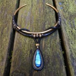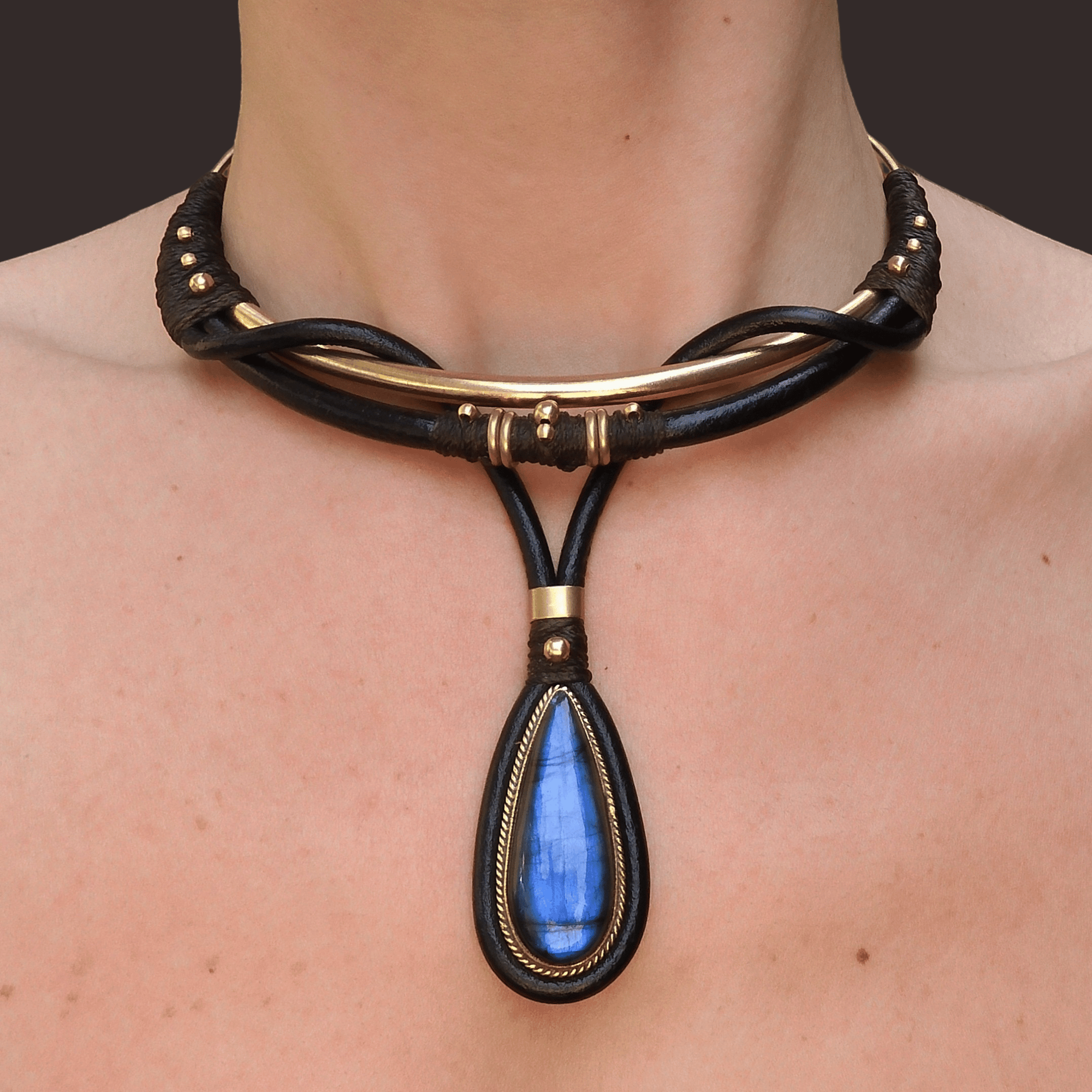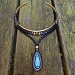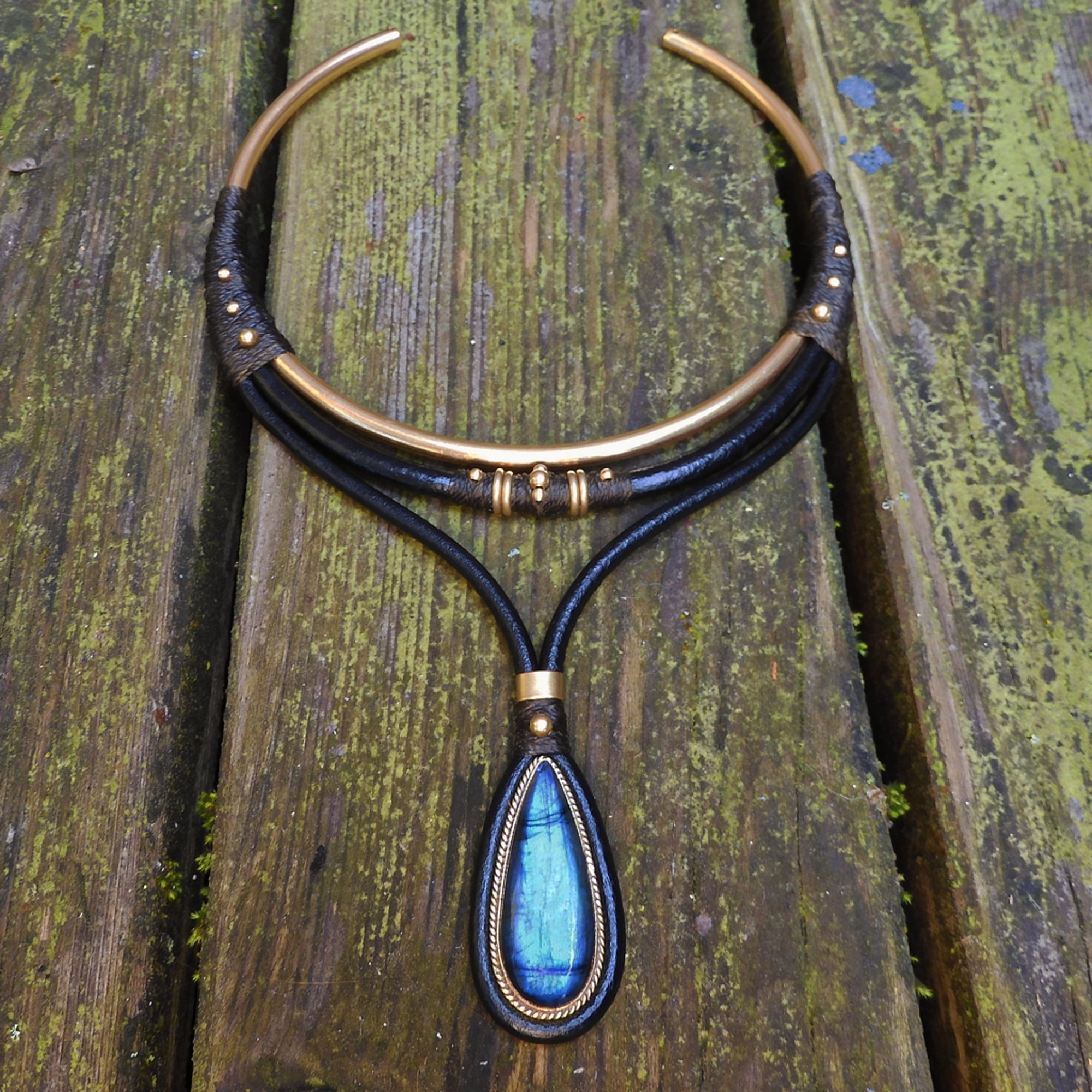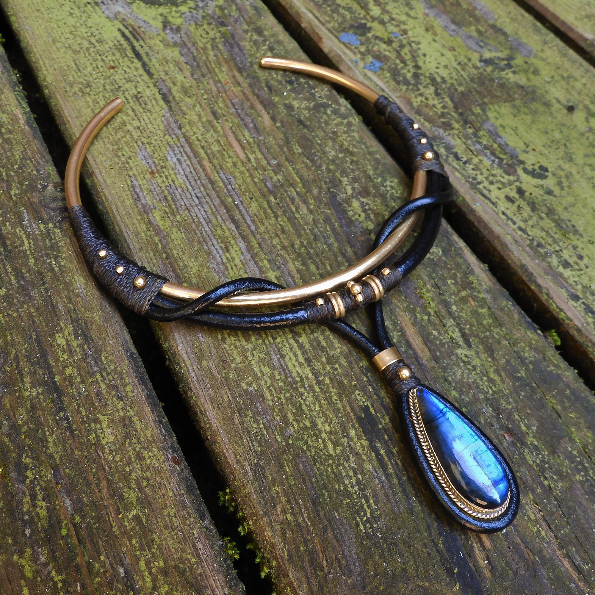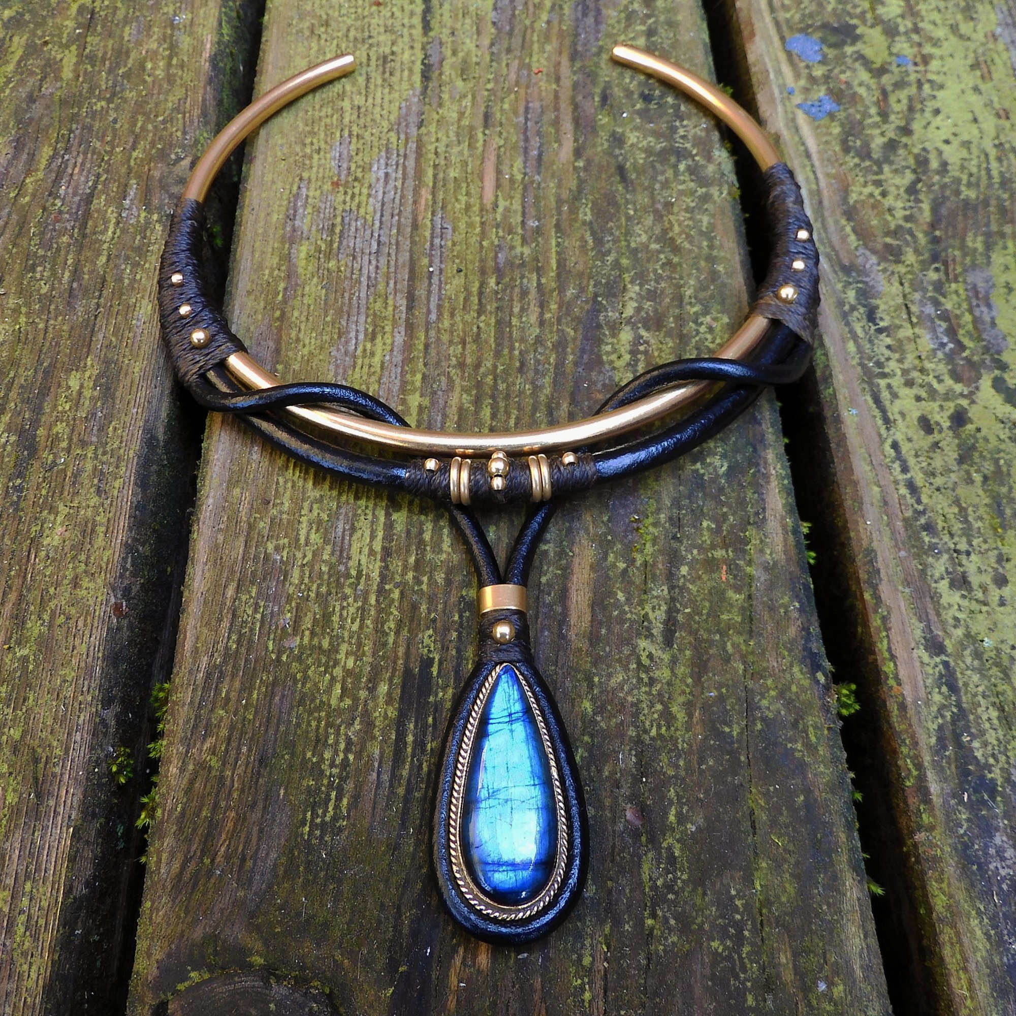 -> Featuring a vibrant blue labradorite pendant using leather, raw brass, and waxed cord. Pendant is 4×2cm.