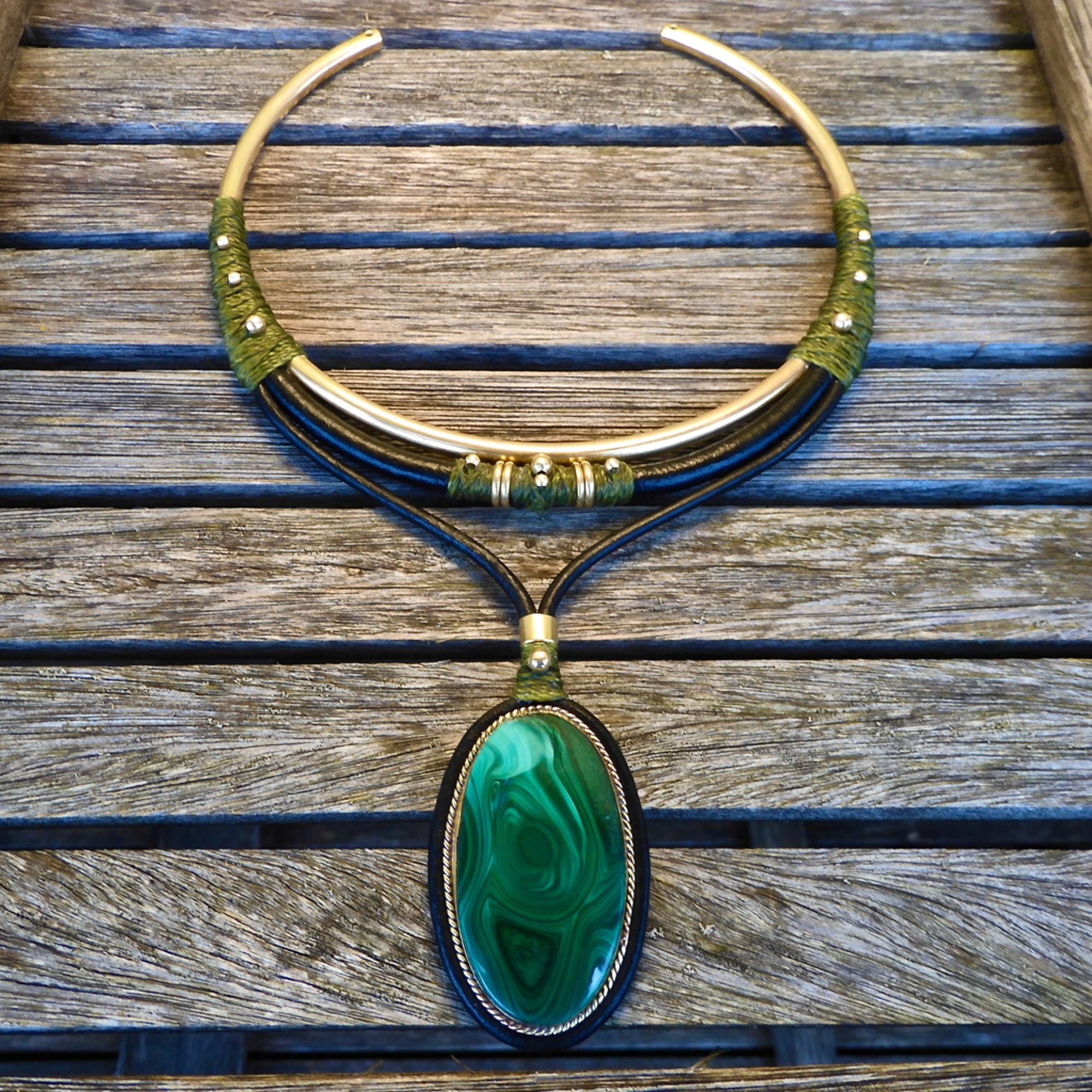 -> Malachite, leather, brass, waxed cord.