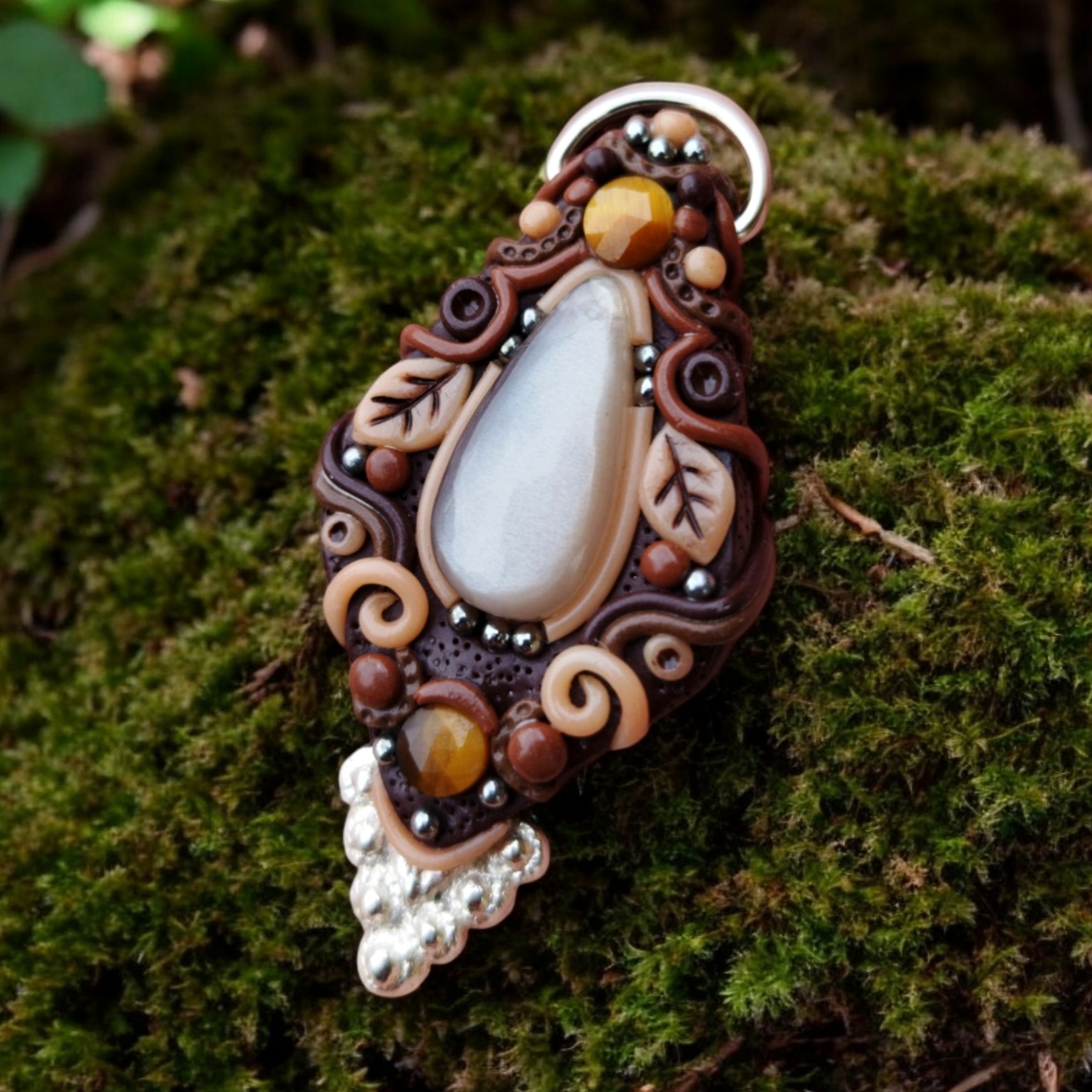 Forest fairy pendant with moonstone and tiger’s eye, handcrafted in earthy browns with silver brass charm accents. A mystical, nature-inspired accessory.