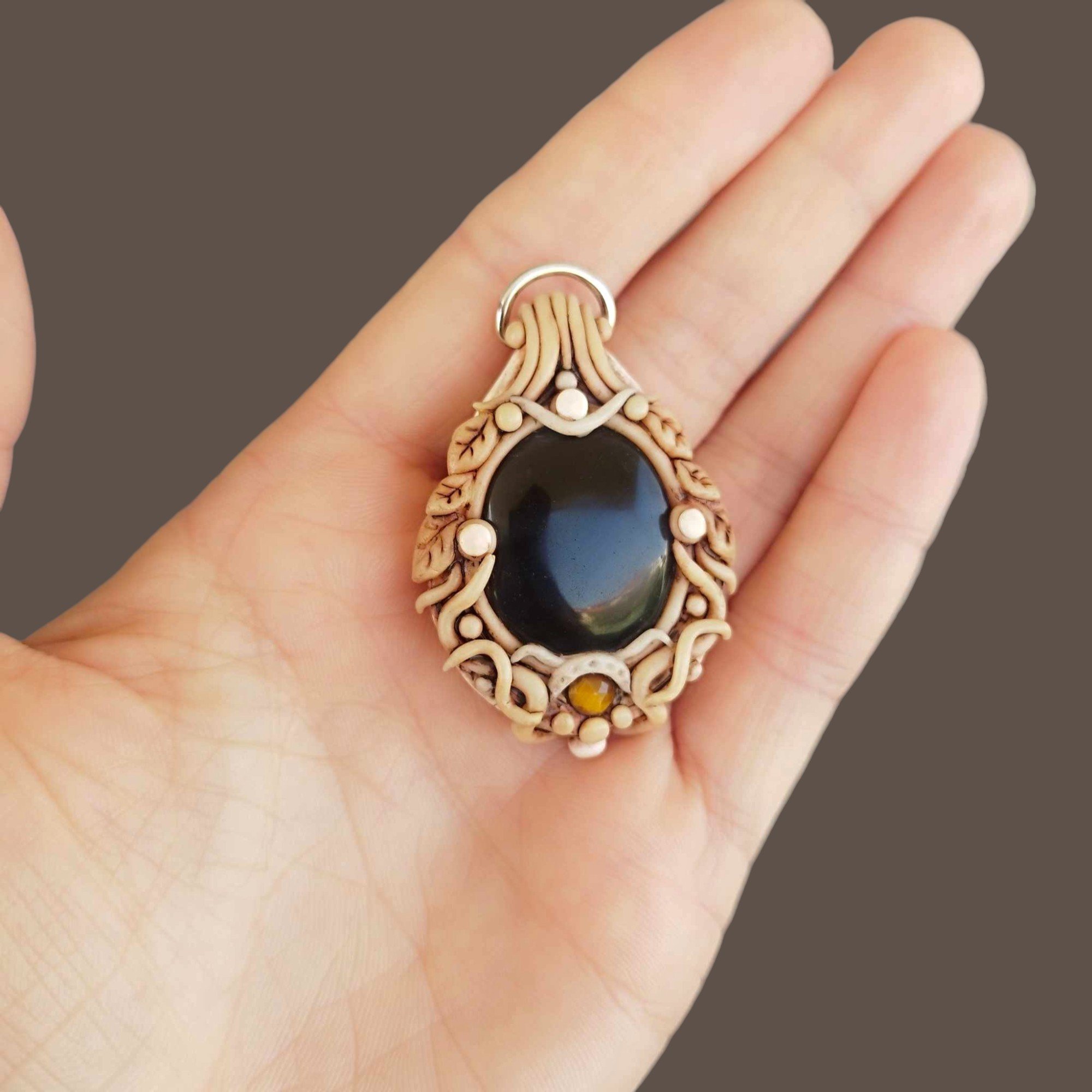 Handcrafted polymer clay pendant featuring obsidian and tiger eye in warm beige tones. A grounding, earthy accessory with natural stone energy.