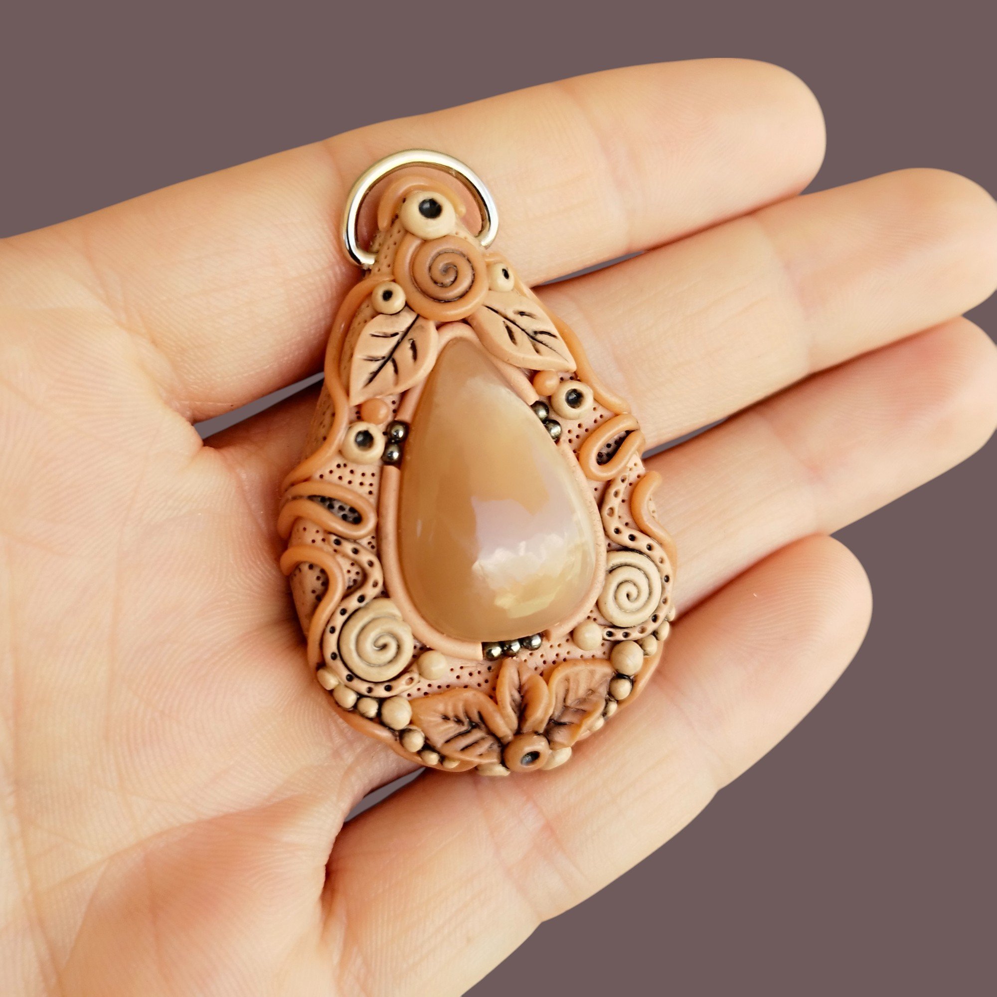 Peach moonstone pendant with organic patterns and delicate leaves, handcrafted for a soft, nature-inspired look full of gentle energy.
