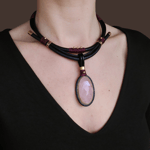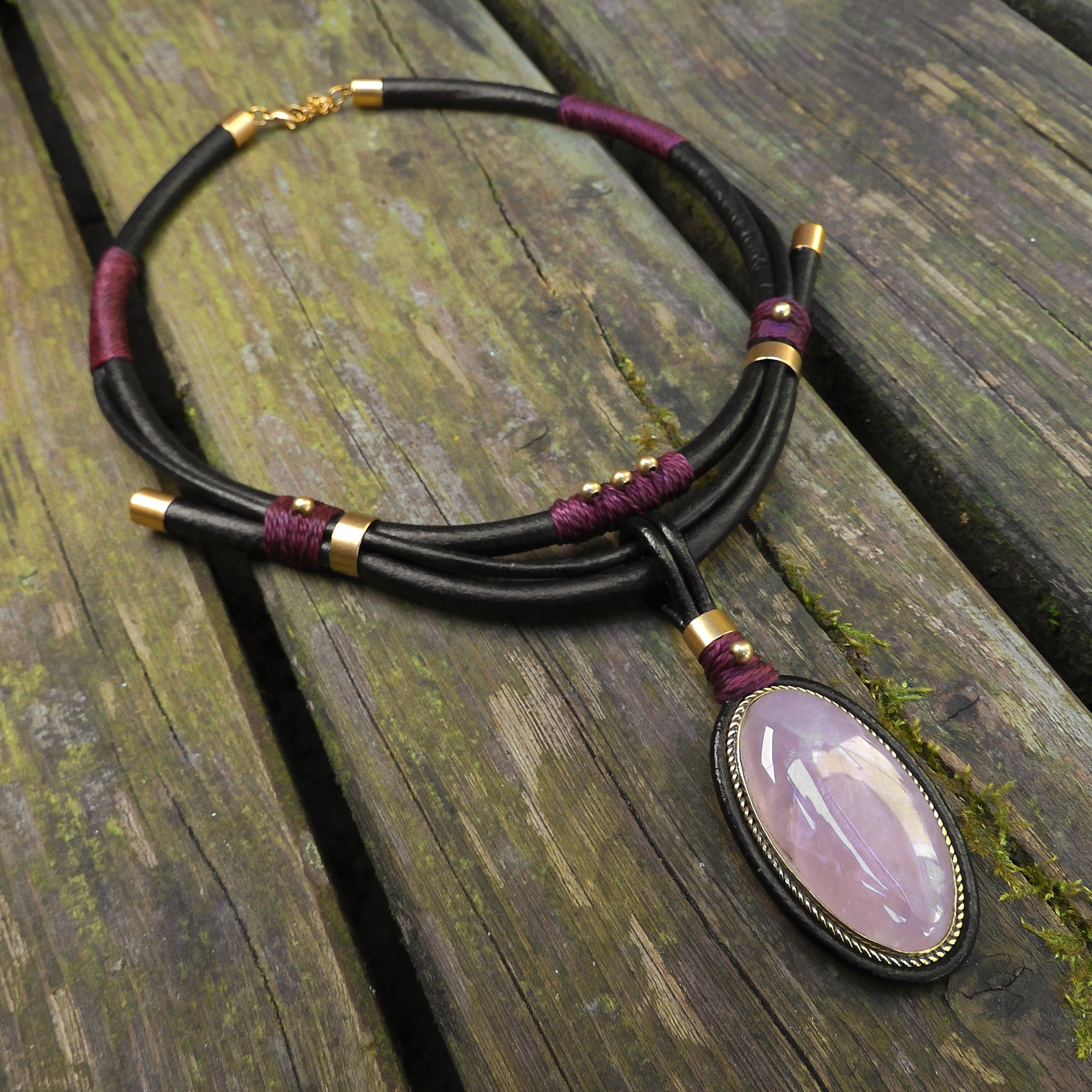 -> Featuring a beautiful pink quartz stone pendant using leather, all raw brass, and waxed cord. Stone is 4.5×2.5cm.