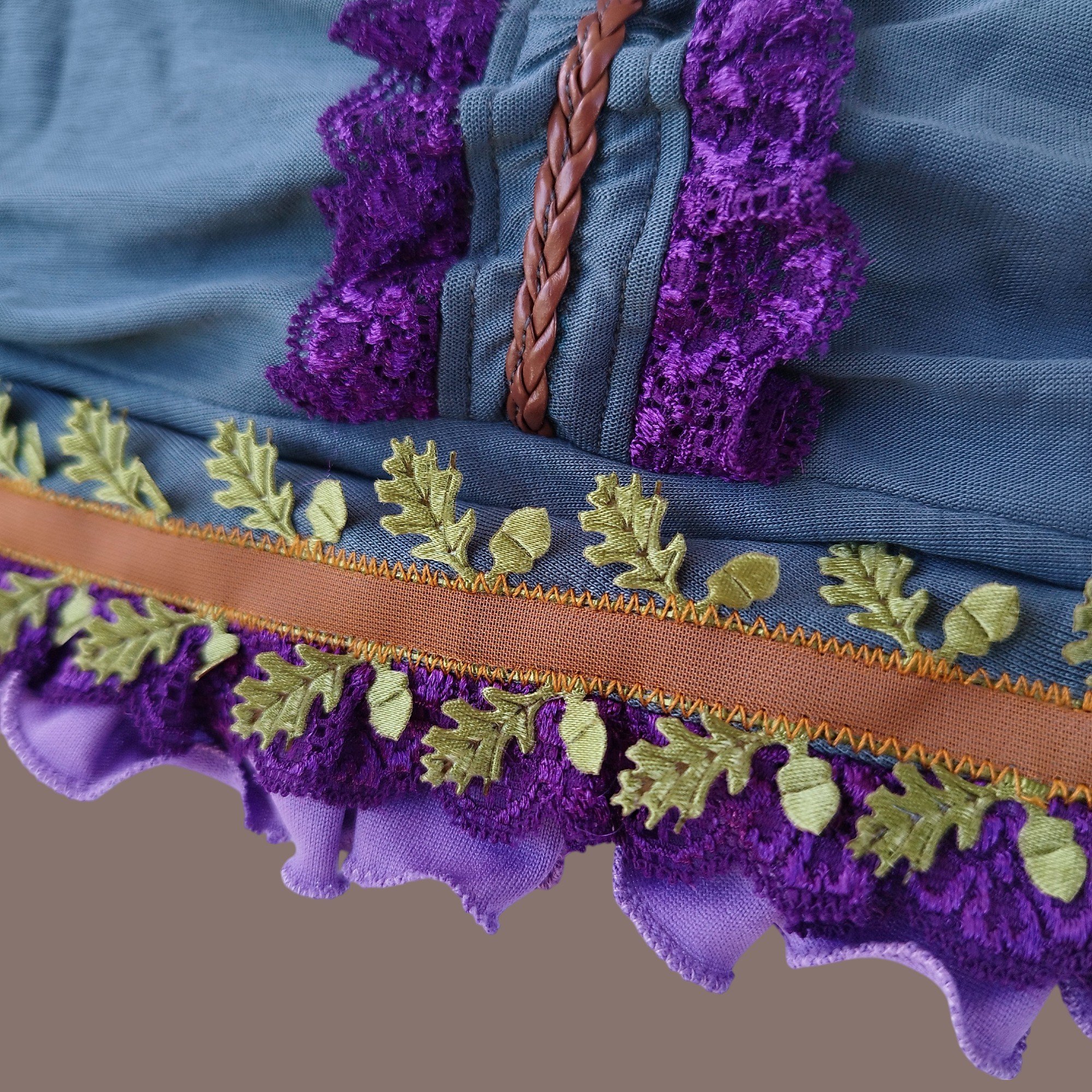 Blue and lilac leaf set with layered textures, frills, a soft stretchy belt, and light fabric that feels weightless. Enchanting, ethereal design perfect for fairy and festival fashion.