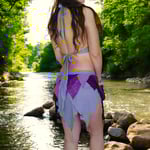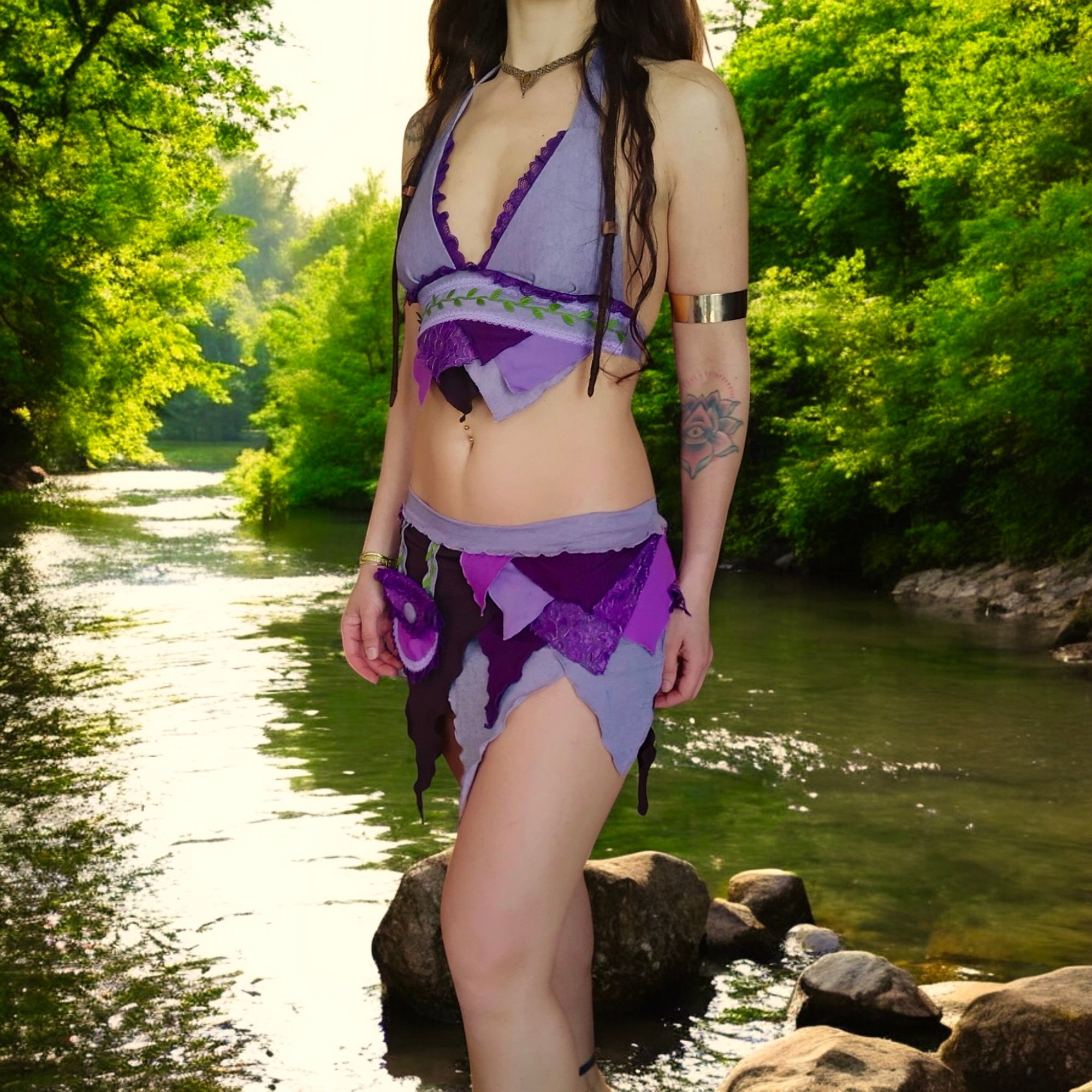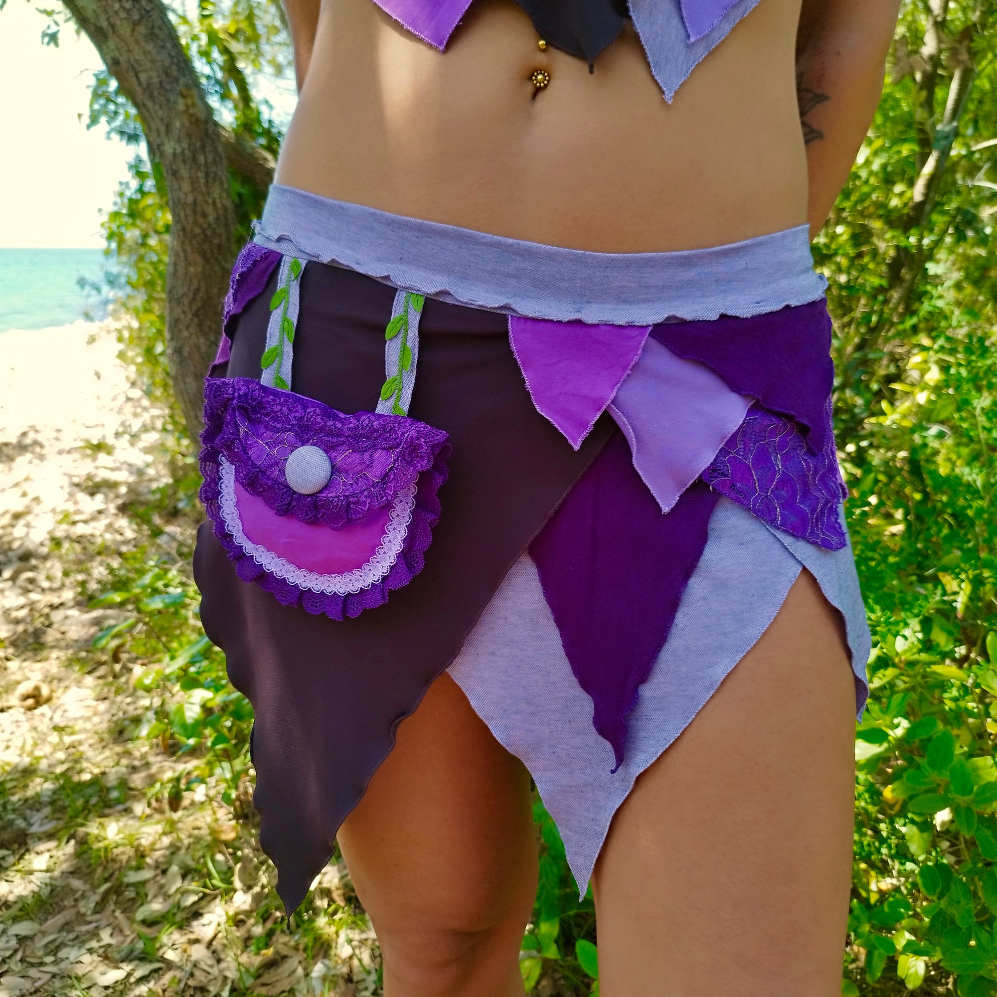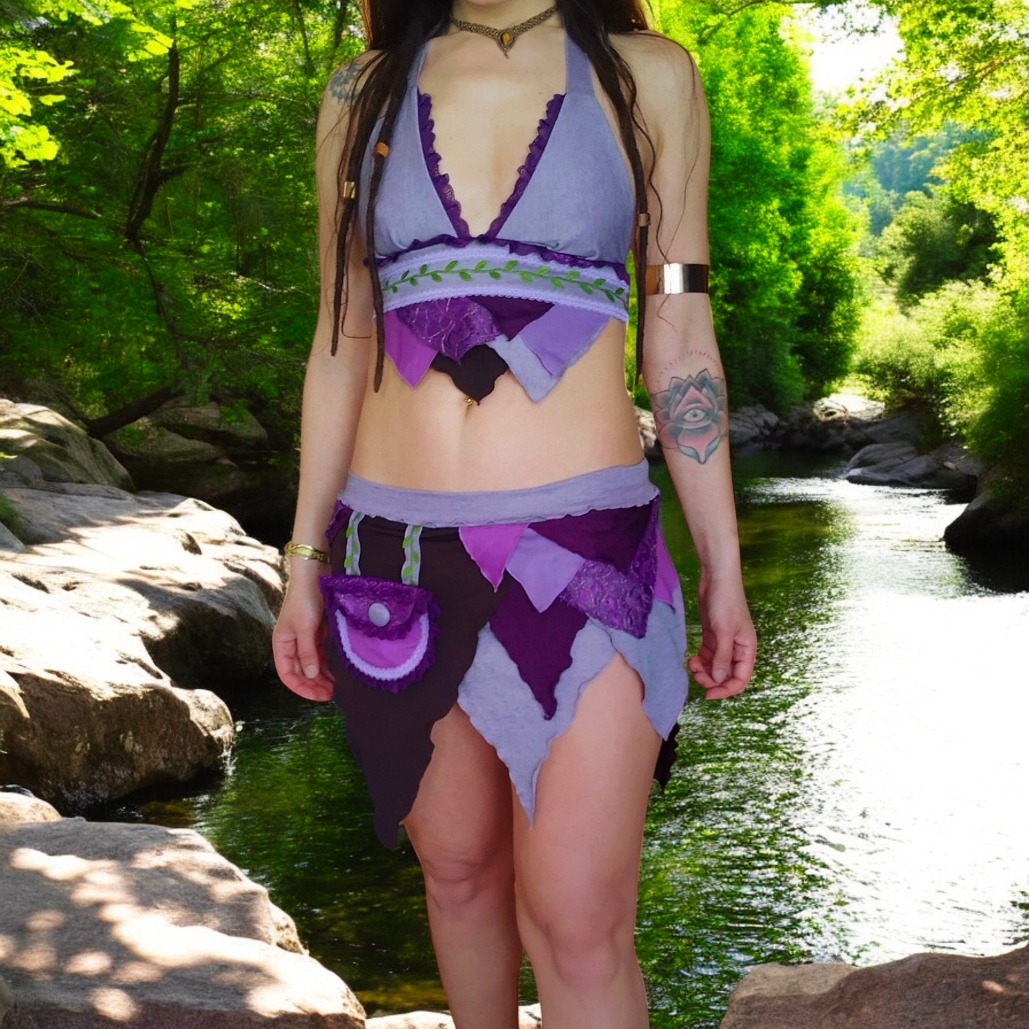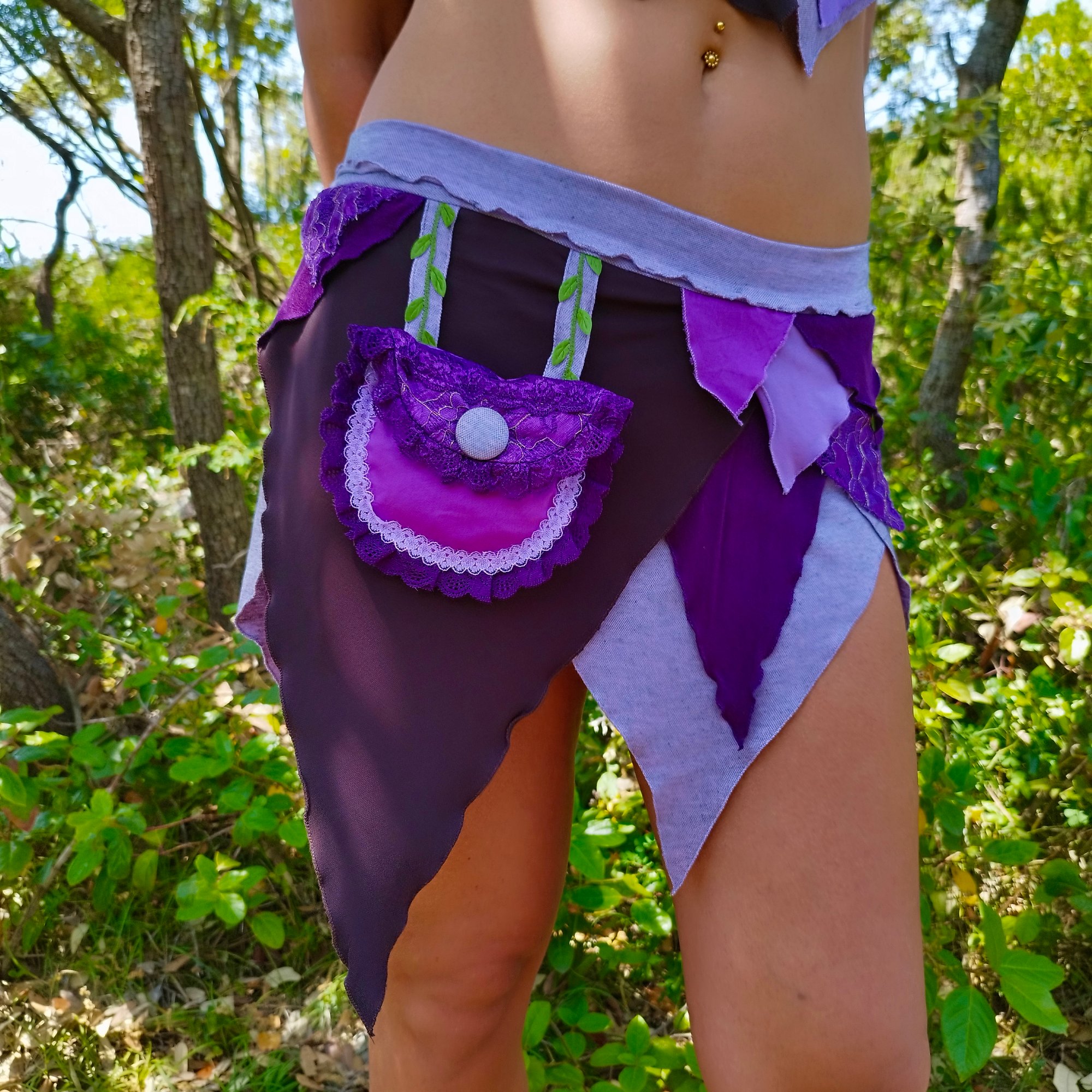 Vibrant mix of purples and lilacs with leaves - with layered textures and different purples, a soft stretchy belt, and light fabric that feels weightless. Enchanting, ethereal design perfect for fairy and festival fashion.