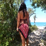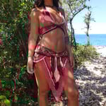 -> Top ties in the back and behind the neck. Skirt is a medium fit.