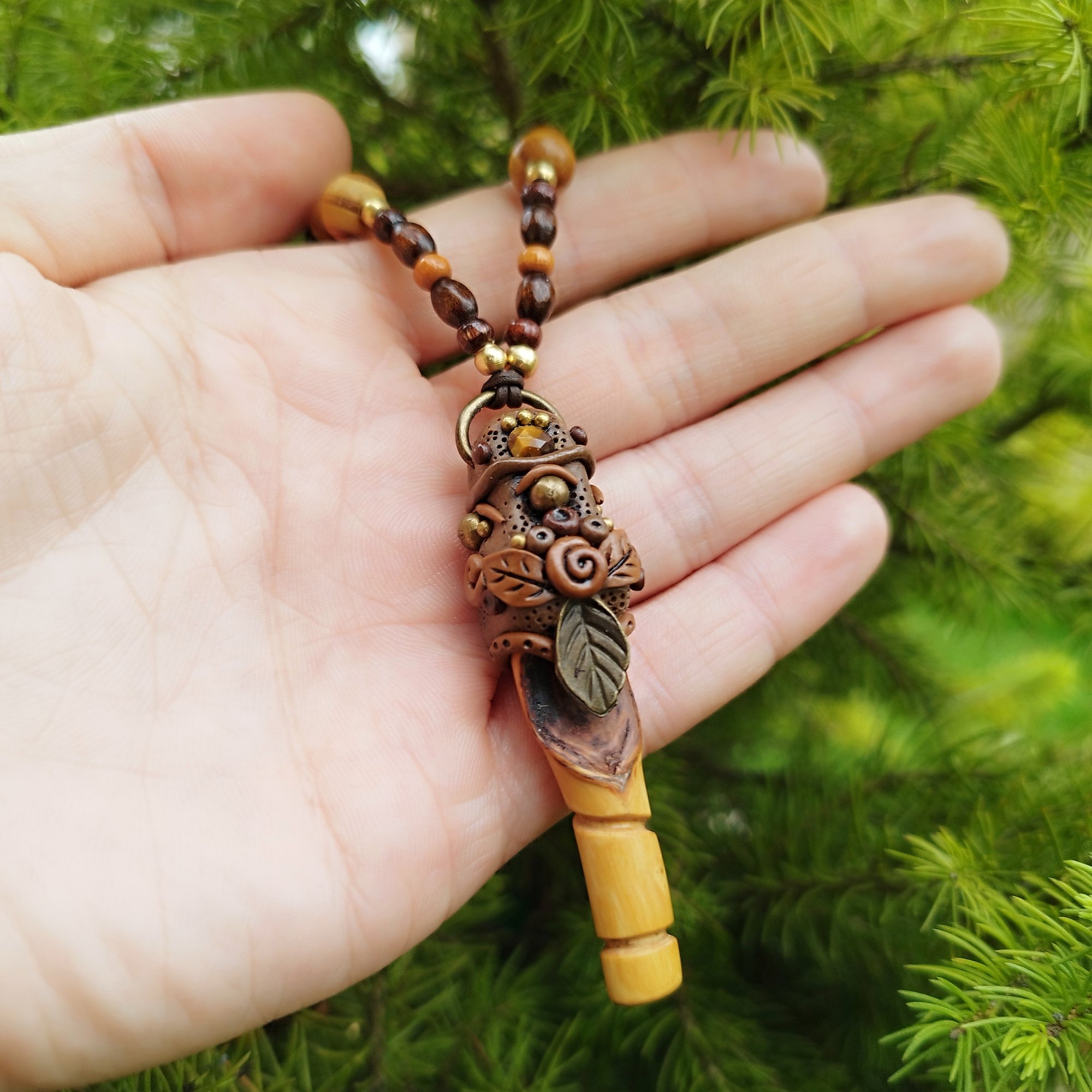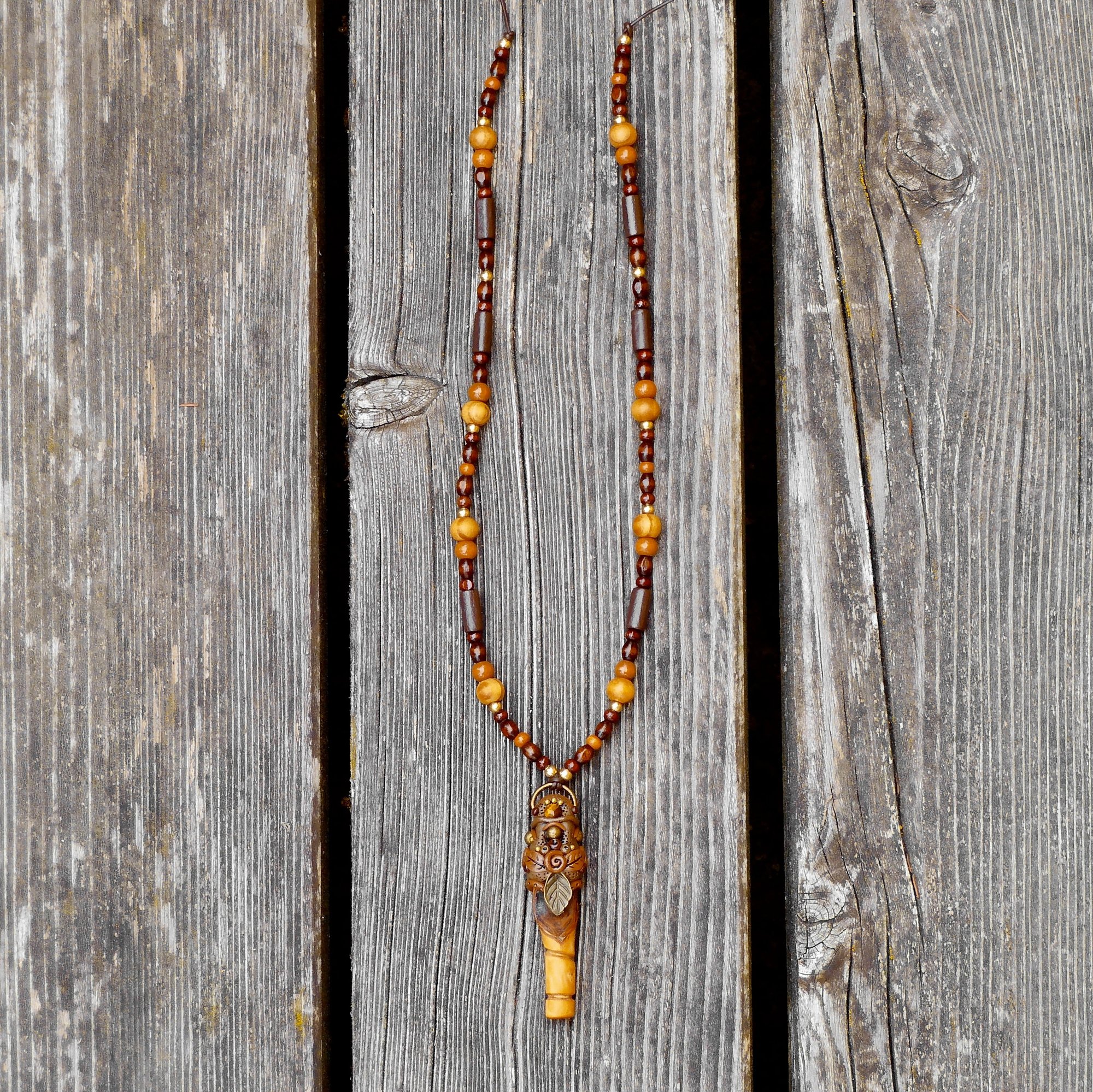 Pendant made from a piece of branch with tiger eye stone in polymer clay. Handcrafted with wood files and very fine sandpaper. Hardened with a natural wood hardener and impregnated with natural oil, both from South America. Necklace featuring wooden and brass beads.