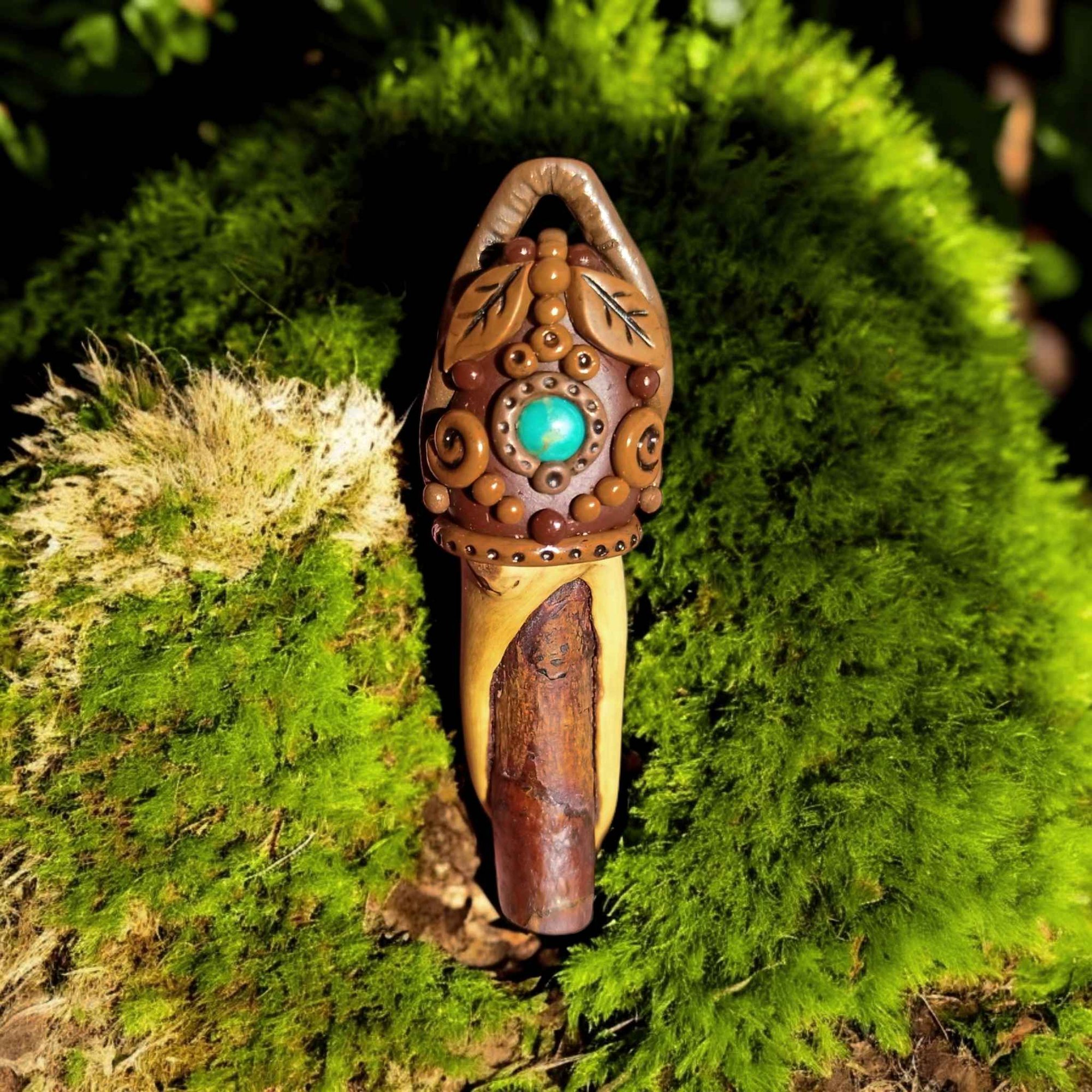 Pendant made from a piece of branch with turquoise stone in polymer clay. Handcrafted with wood files and very fine sandpaper. Hardened with a natural wood hardener and impregnated with natural oil, both from South America.