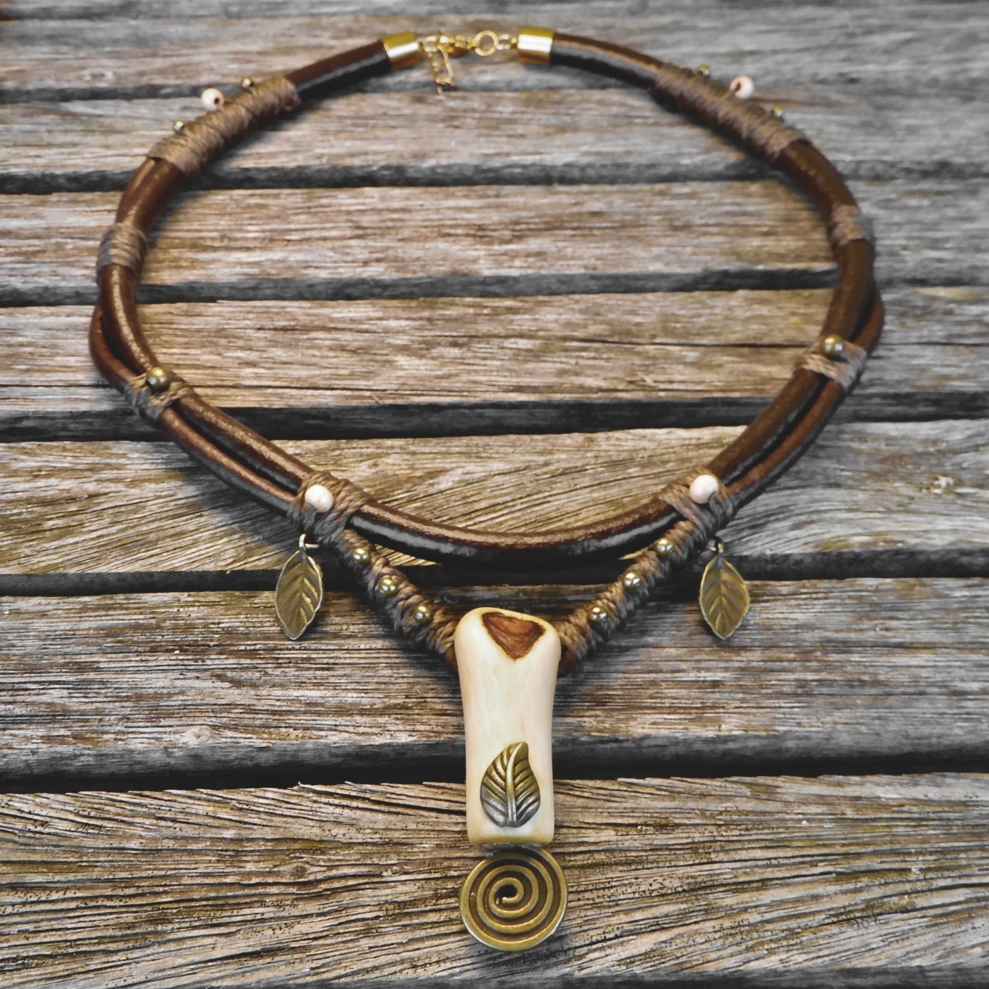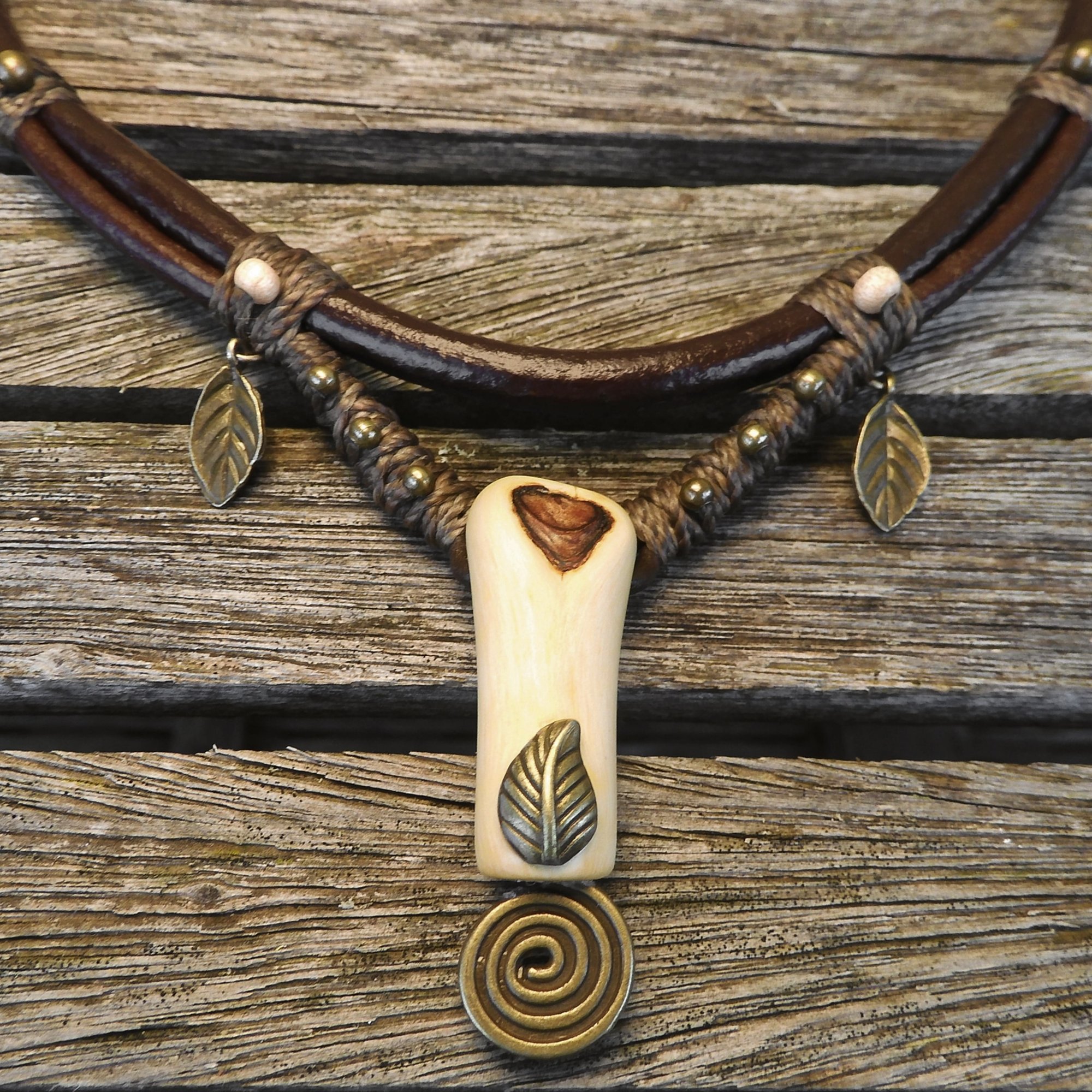 -> Rustic bronze leaf charms and spiral charm accents.